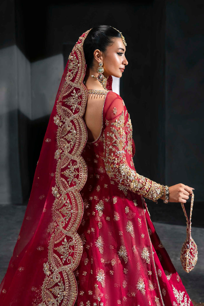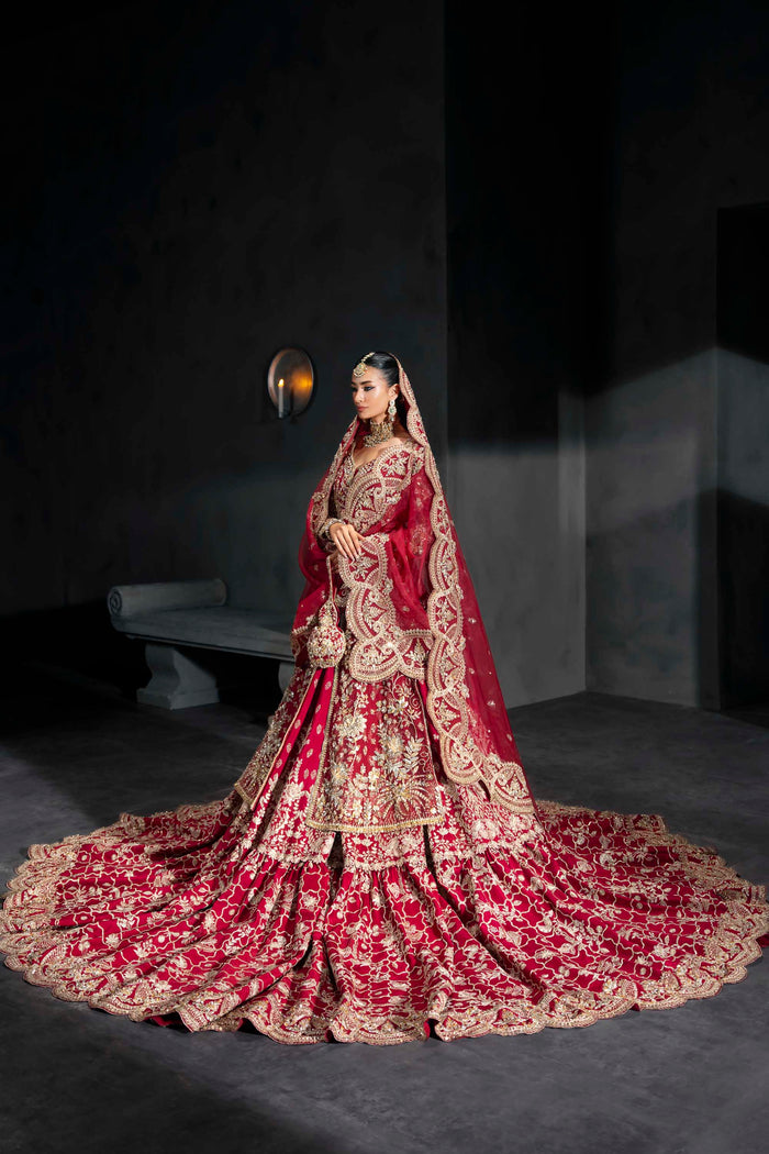 Make a powerful bridal statement in this deep crimson lehenga by Akbar Aslam—an ensemble that blends imperial grandeur with refined detailing. The fitted bodice and full sleeves are richly embellished with intricate gold embroidery, extending seamlessly into a sweeping lehenga that features heavy traditional motifs and layered textures. A dramatic dupatta, framed with wide, ornate borders, completes the ensemble with grace and authority. Paired with a handcrafted pouch, this design is crafted for brides who want to embody tradition, strength, and timeless elegance on their big day.