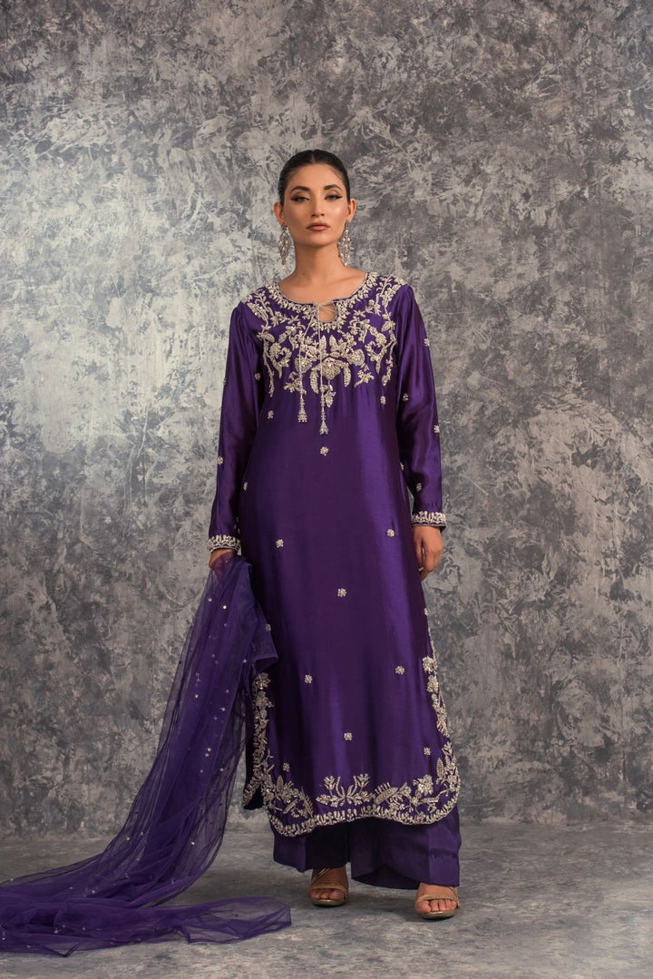 Indulge in the epitome of elegance with miral, an exquisite long sheesha silk shirt in a rich, luxurious purple tone. This opulent piece is a celebration of timeless beauty, featuring intricate embroidered borders and a neckline that enhances its sophisticated design. The meticulous craftsmanship is showcased through fine embellishments that adorn the entire border of the shirt, creating a stunning visual effect. To elevate the ensemble even further, it js paired with a fully sequin net dupatta, adding a touch of glamour and completing the look with grace and finesse.