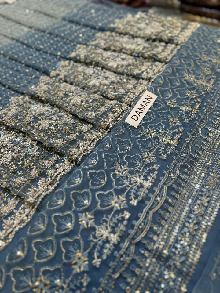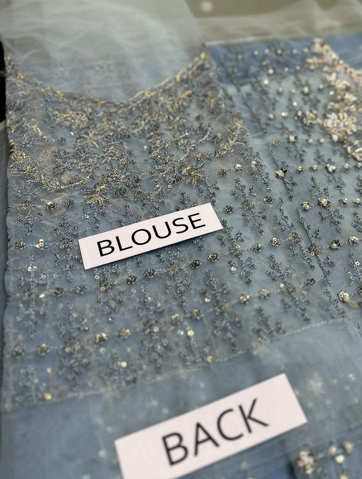Evoking the femininity of a sweeping silhouette, Miyah is a breath of fresh air. Fashioned from dainty net fabric in an ombr? ice blue hue, the majestic pishwas showcases a myriad of heritage crafts such as resham and tilla, arranged with great attention to detail in a meticulous linear pattern. Paired with a silk churidaar and an embroidered organza dupatta, this piece is sure to make heads turn at every event.