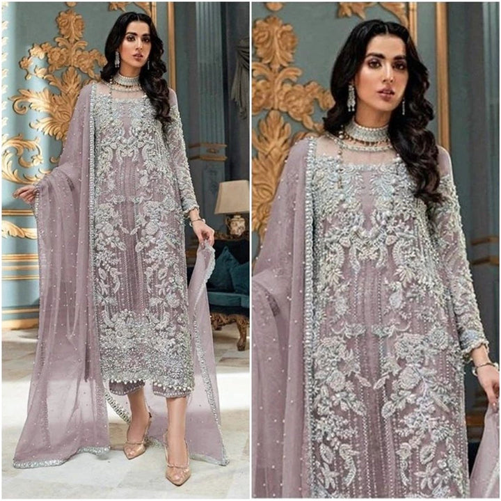 This mauve long shirt crafted from pure silk organza is heavily ornamented with Crystal's and thread work. This luxurious outfit is finished with raw silk pants and a pearl embellished dupatta for an ethereal look.