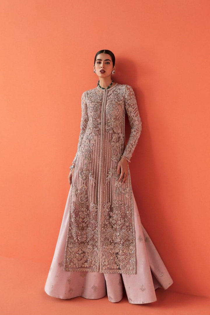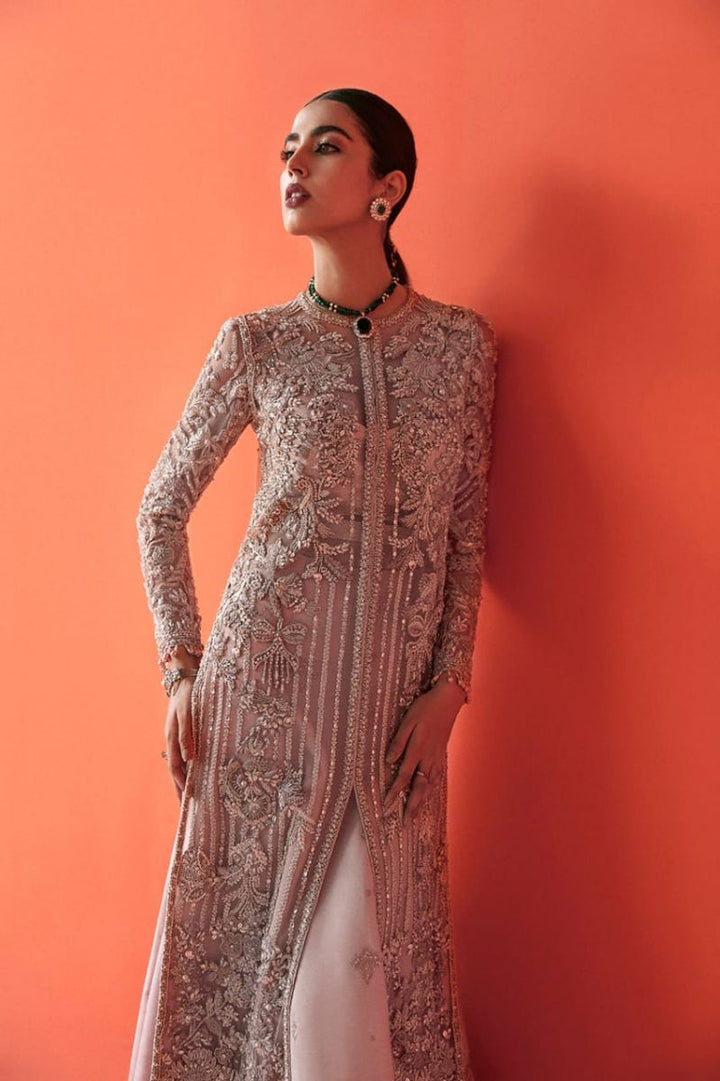 Amtul exquisitely features the beaming crystals all over the front-open organza jacket made out of net. Paired with the conventional lehnga on the refreshing tone of lavender; a complete look straight out of your dreams.