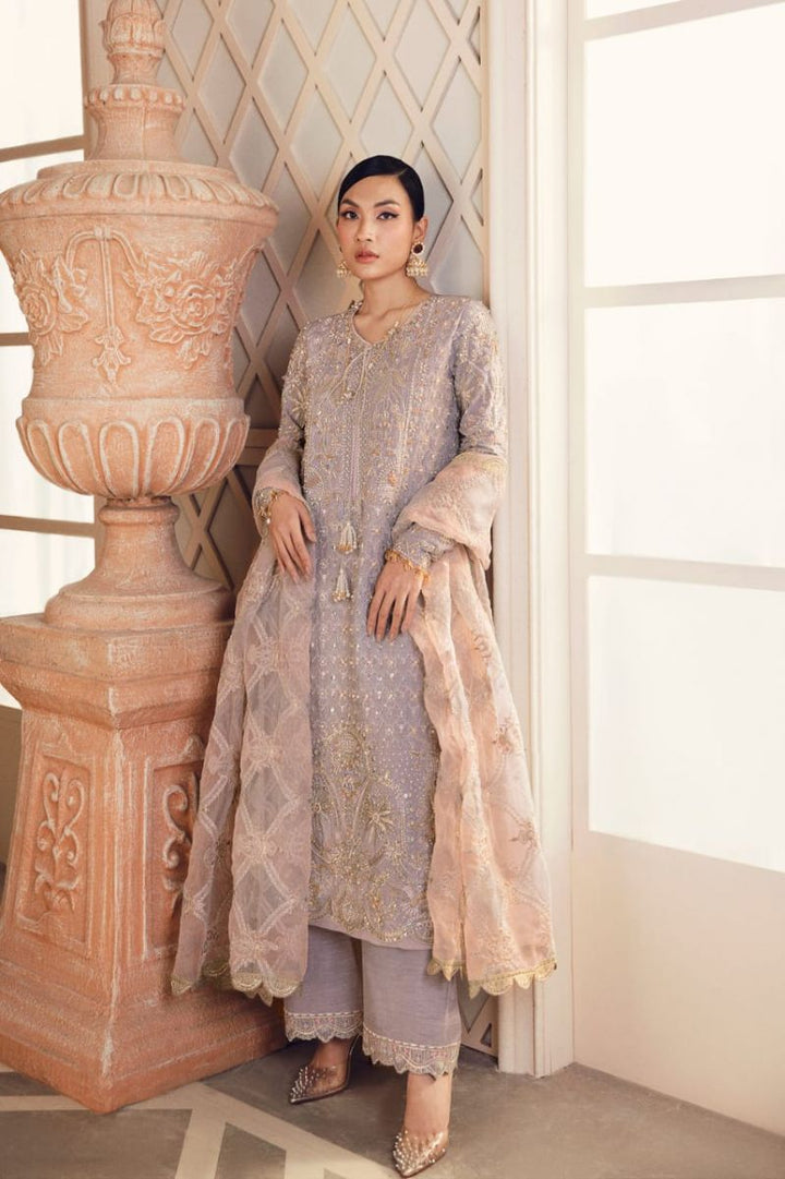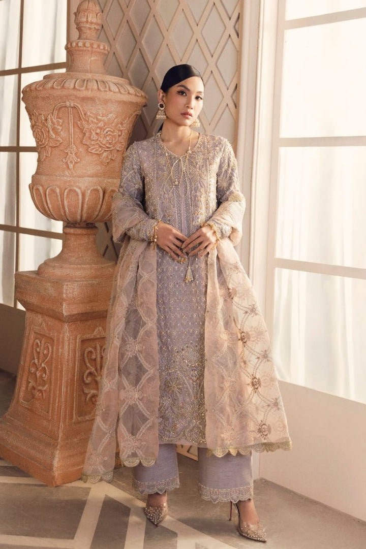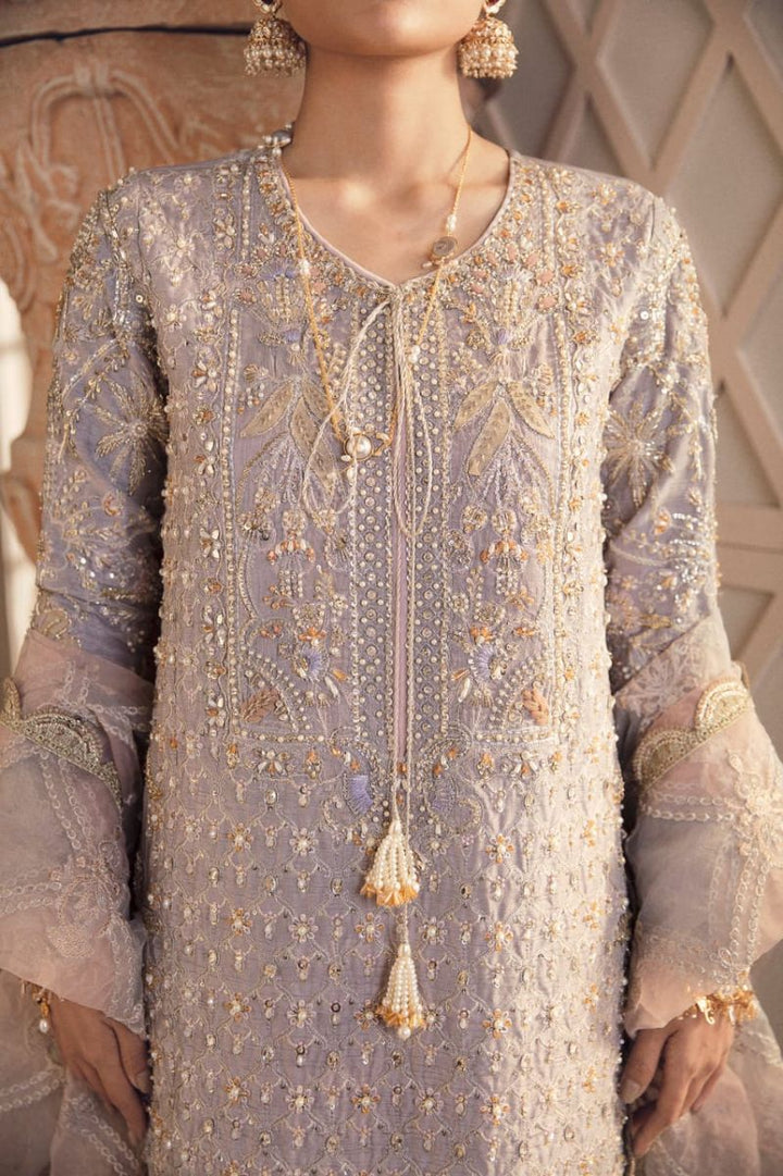 The Lilac colour palette features sensational embroidery which is hand-pricked with the gleaming embellishments all over the organza shirt and pearl tassels on the neckline. Paired with the beautiful matching dupatta and pants.