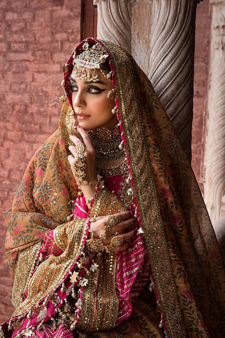 Step into the lush and vibrant world of 'Naranji Bagh,' where the ensemble's rani pink and red hues are a testament to its opulent charm. The embroidered organza shirt is a masterpiece, adorned with exquisite hand-embellished pearls, sequin and mirror work, and allover sequin detailing on the sleeves. Two different satin silk borders in parrot green and mustard add a unique and lively contrast.The embroidered gharara, enriched with intricate details and embroidered satin silk border, adds a touch of sophistication to this ensemble. The printed dupatta on cotton slub, adorned with sequin and embroidered four-side satin silk border, completes the picture of timeless elegance. 'Naranji Bagh' is a celebration of color and craftsmanship, ideal for brides who seek an extraordinary and unforgettable look.