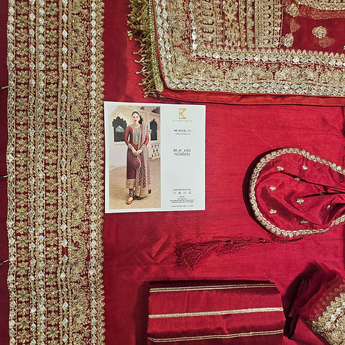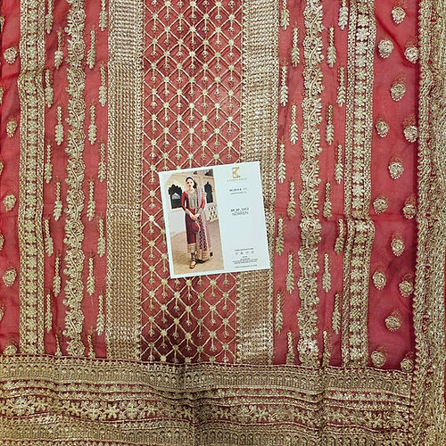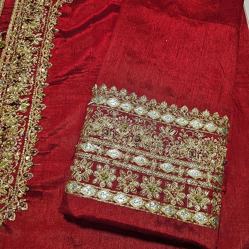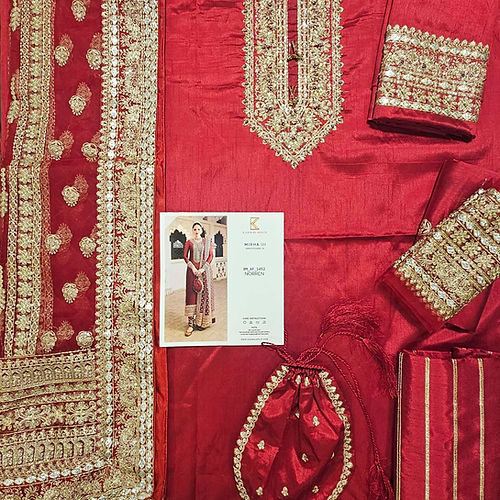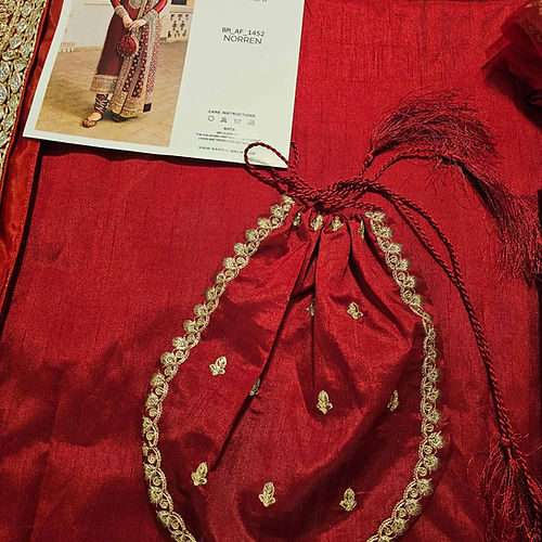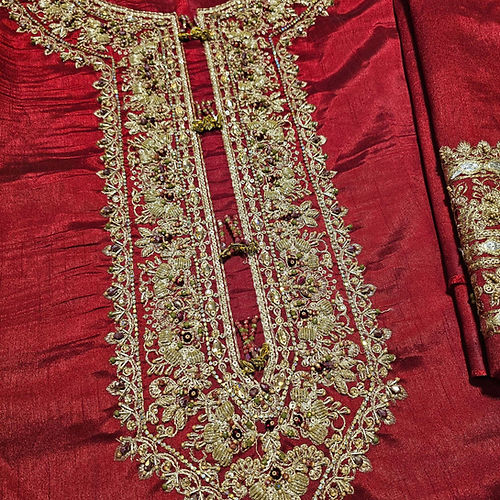 Indulge in the epitome of elegance with our exquisite long tissue silk shirt in a luxurious rich deep red tone. This opulent attire is a testament to timeless beauty, featuring intricate embroidered borders and a neckline that adds an extra layer of sophistication to its design. The meticulous craftsmanship is evident in the fine embellishments adorning the entire border of the shirt, creating a stunning visual feast. To elevate the ensemble further, the outfit is accompanied by a fully embroidered dupatta, adding a touch of glamour and completing the ensemble with finesse.