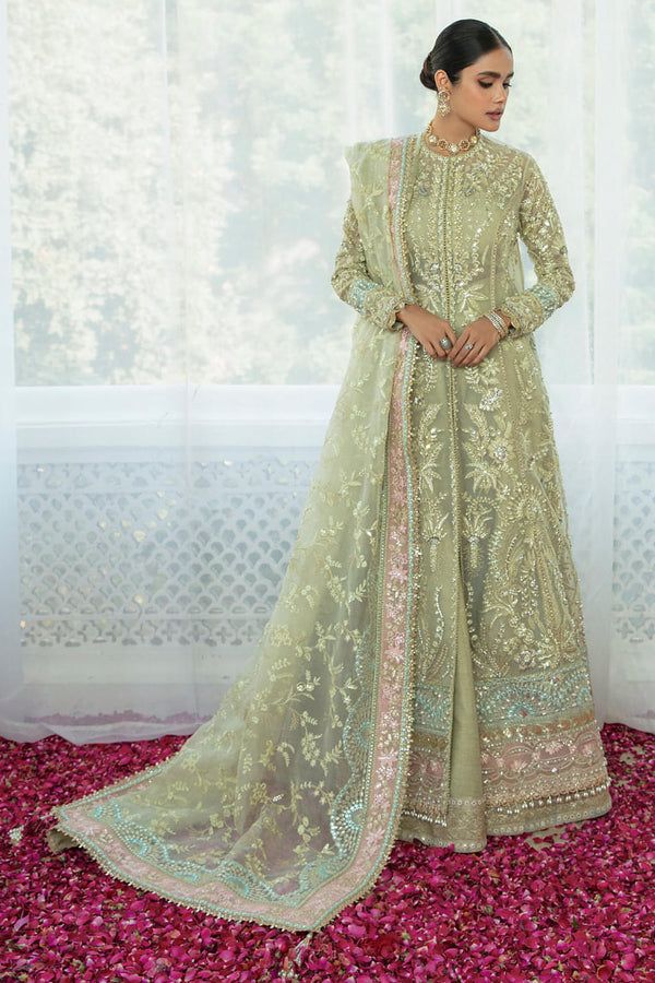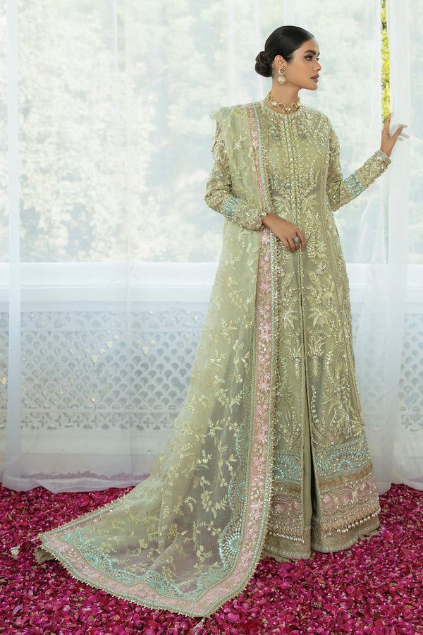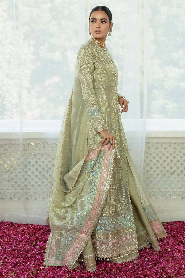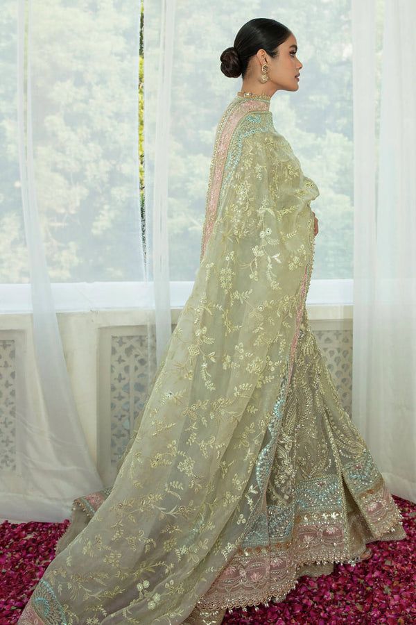 Aster is a uniquely encrusted festive piece joyously dipped in moss green shade with hints of pink and blue tones. A meticulously draped flared open organza shirt and dupatta embellished with regal handwork details, pearls, and crystals further fused with gota and handmade sheesha adornments. It comes with refined silk pants to complete an ethereal festive ensemble.