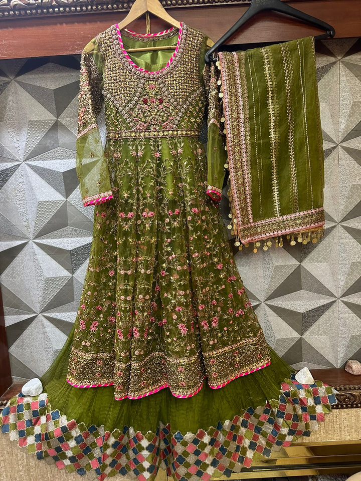 An outstanding stunner earthy green net peshwaz enhanced with intricate blush pink sequins and gold naqshi and dabka to create a graceful look. It is paired with minimal medium silk sharara with exquisitely embellished organza border. Its heavily embellished dupatta with alluring border is further enhanced with a slight pop of hot pink facings and an added lace detailing.
