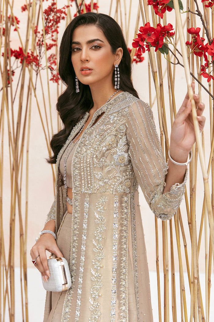 Dipped in golds and silvers this regal attire is a breath of fresh air for this wedding season. Blooming florals, meticulous hand-crafted modern patterns envisioned on a gold tissue base. Hand embroidered with lush gold and silver threads finished with elegant hand embellished crystals, delicately cut mirror pieces, sequins and gold zari. Paired with raw silk lehnga with lace stitching detail.