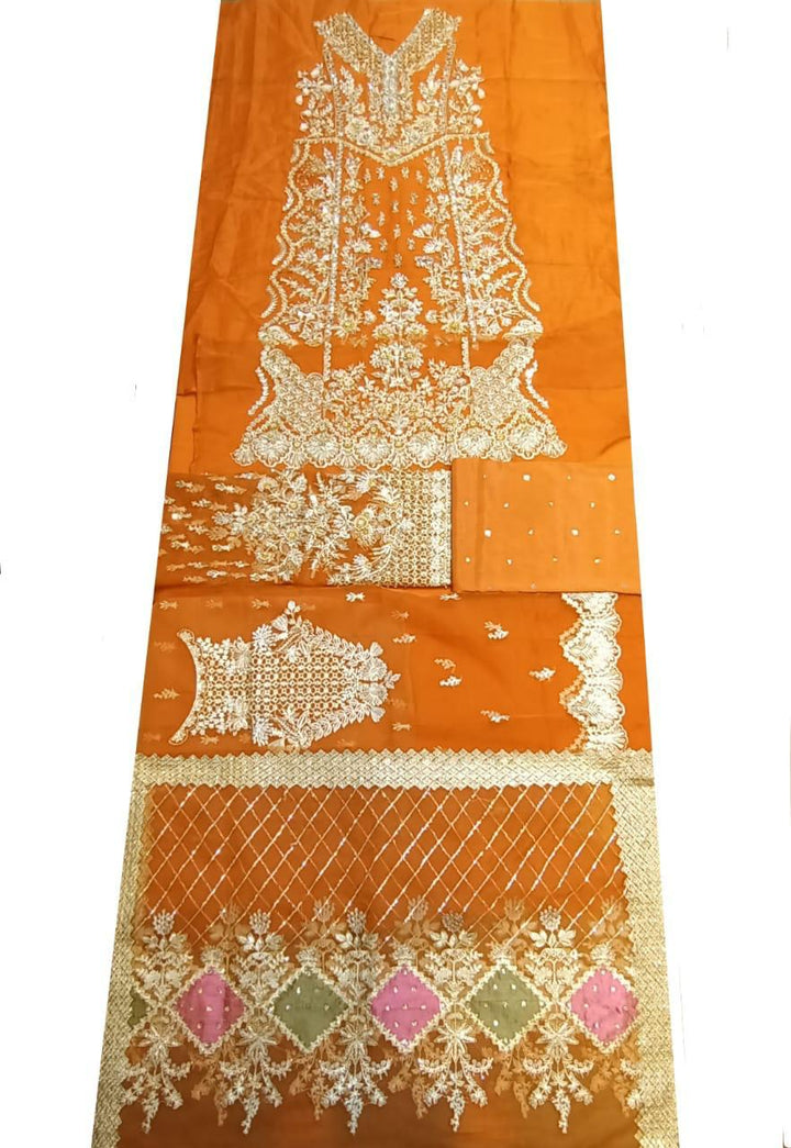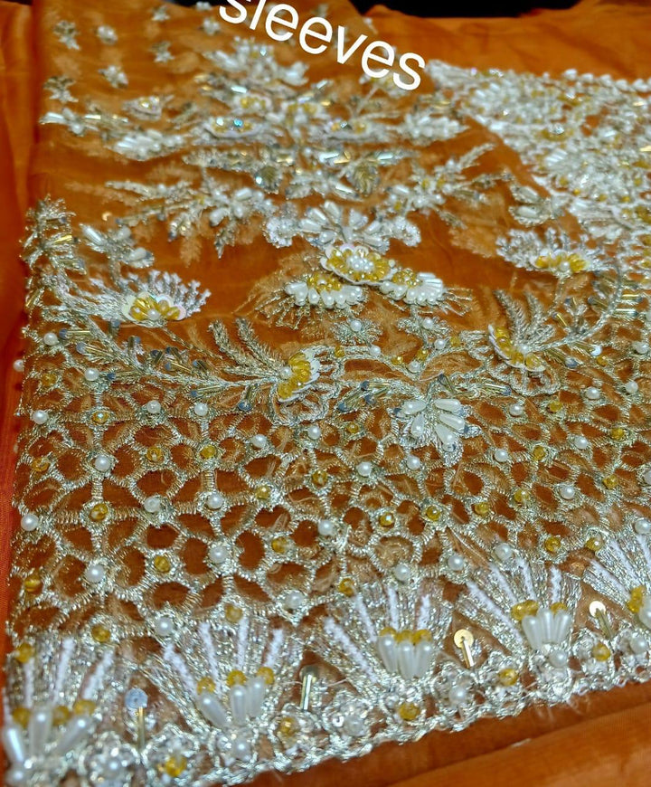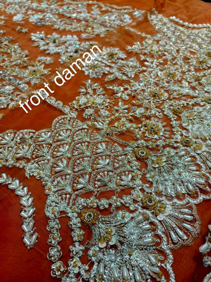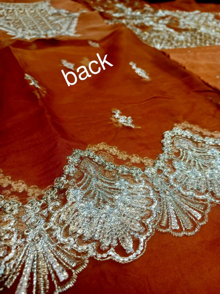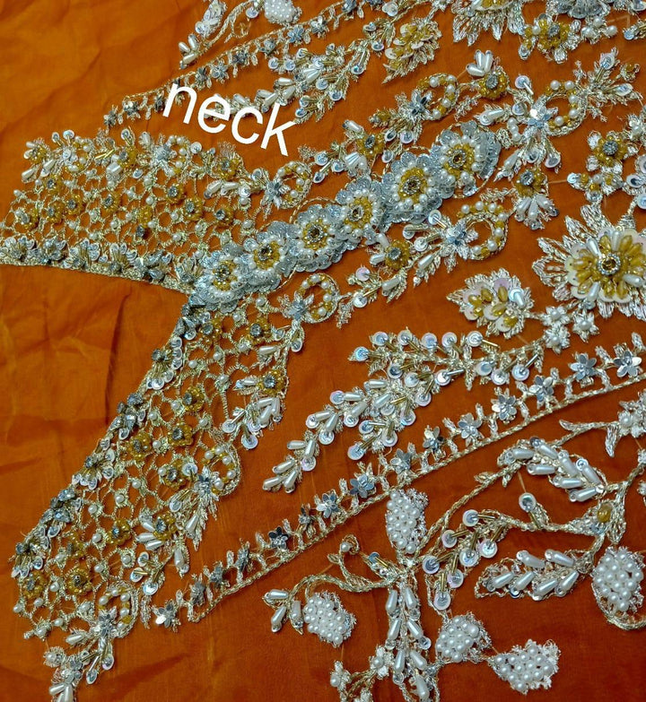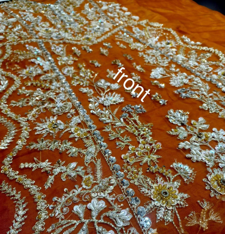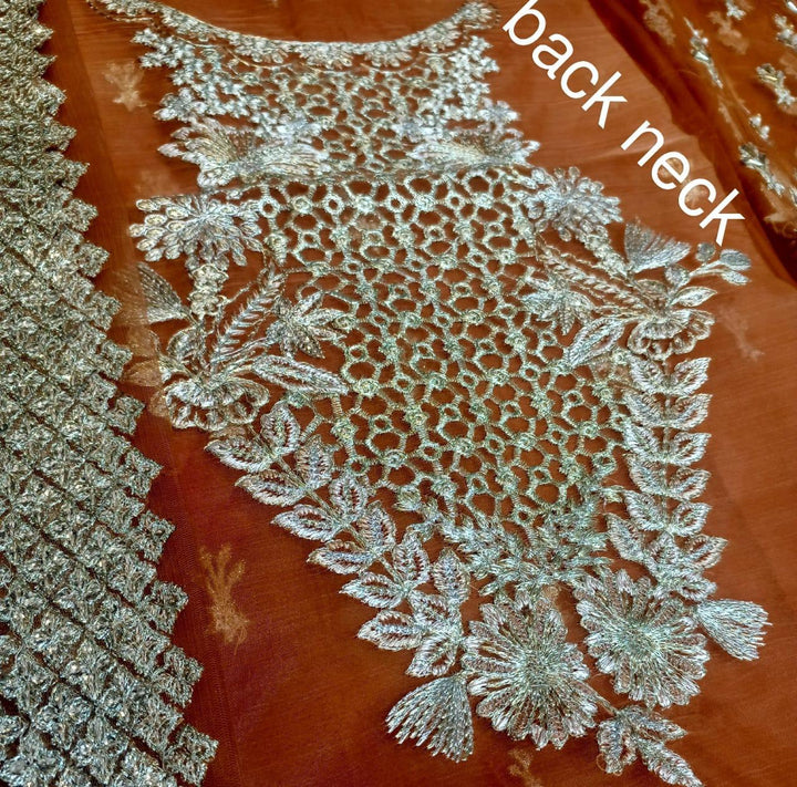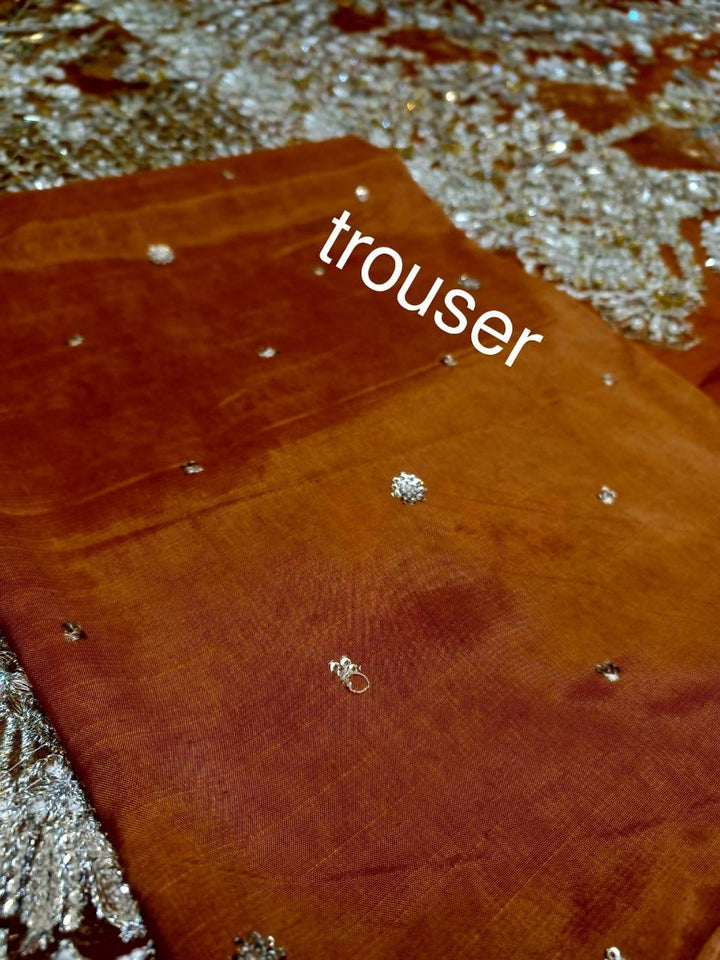 Rust never looked so ravishing! Introducing our breathtaking Naira festive formal dress, in the rich hue of rust, this gown is truly a delicate composition, with its attention to detail and exquisite craftsmanship paired with a gleaming sharara. From the moment you slip into this standout piece of Sarang bridals and Formals, you'll feel like the most beautiful and confident version of yourself. The gotta and dabka naqshi work on this dress adds a touch of sparkle, and the delicate pink and lilac threads used in the embroidery work add a feminine touch to the entire ensemble. Naira is the ideal choice for you to keep it trendy yet traditional.