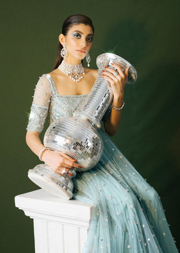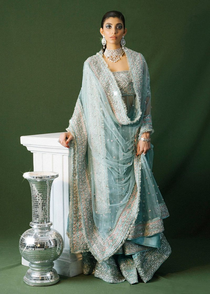 This ice blue net pishwas is gorgeously emberoided in hues of pinks and blues along with silver tilla. Adorned with pink and silver pipe work, mukesh, dabka, naqshi and stones.Completing the look with crushed silk sharara with heavy borders along with net dupatta featuring thick embellished four sided borders.