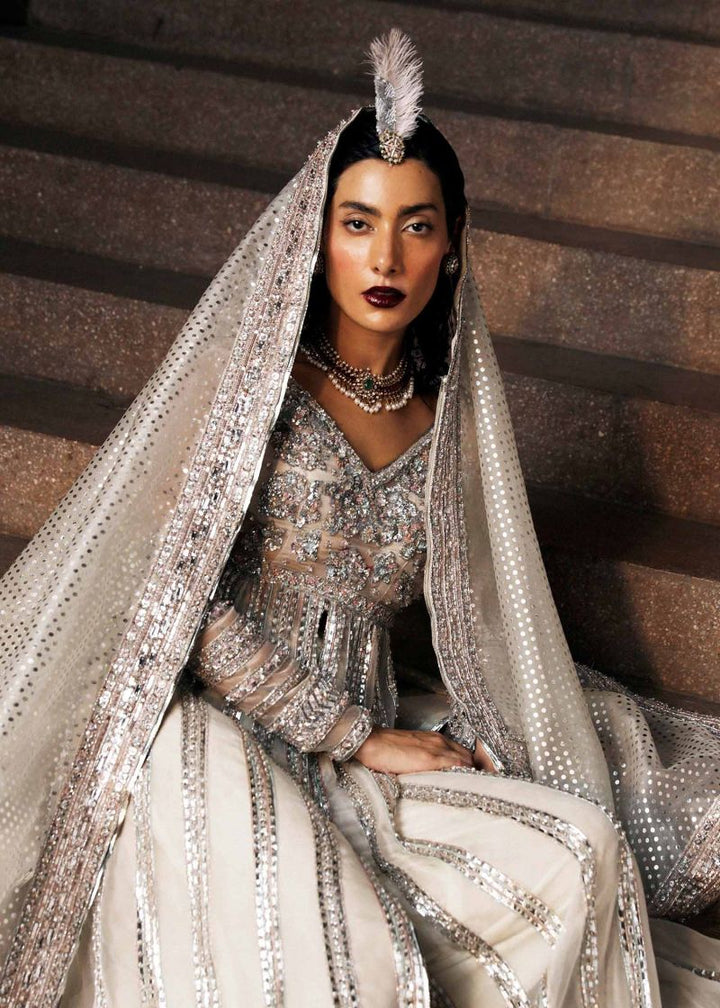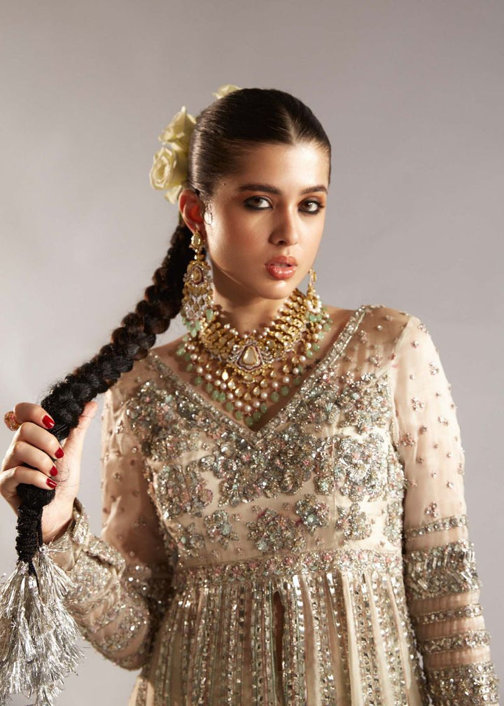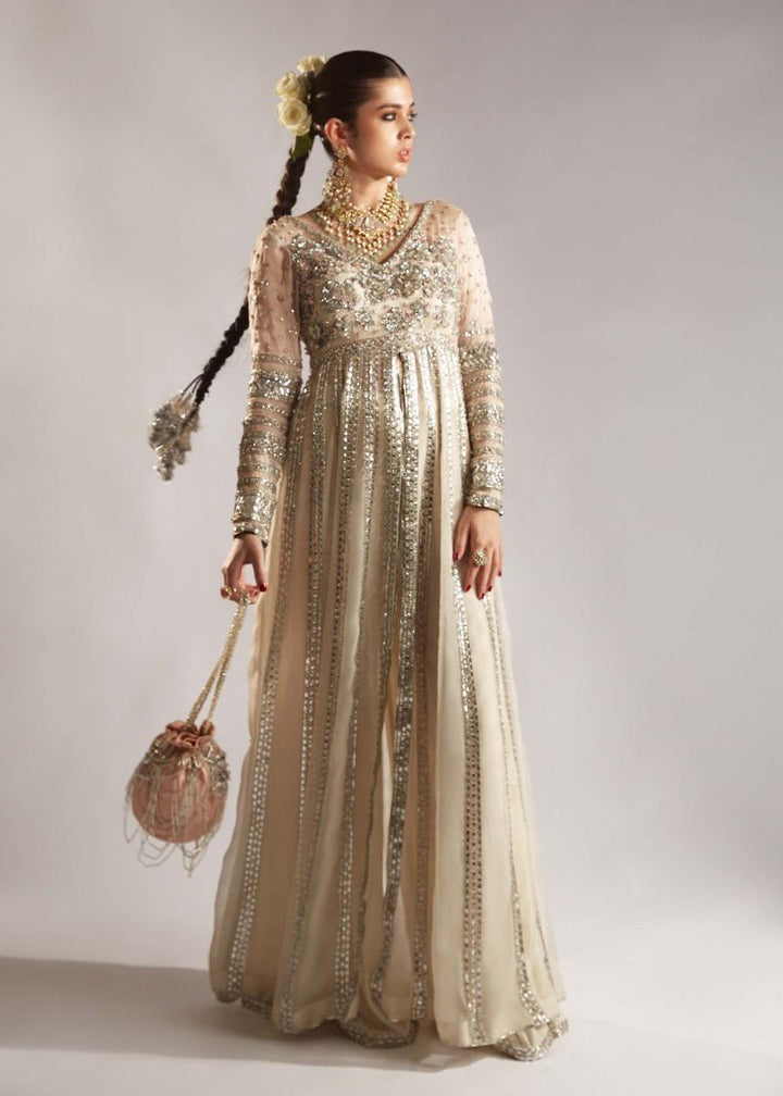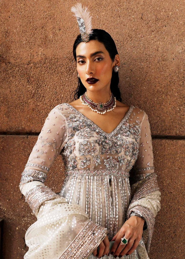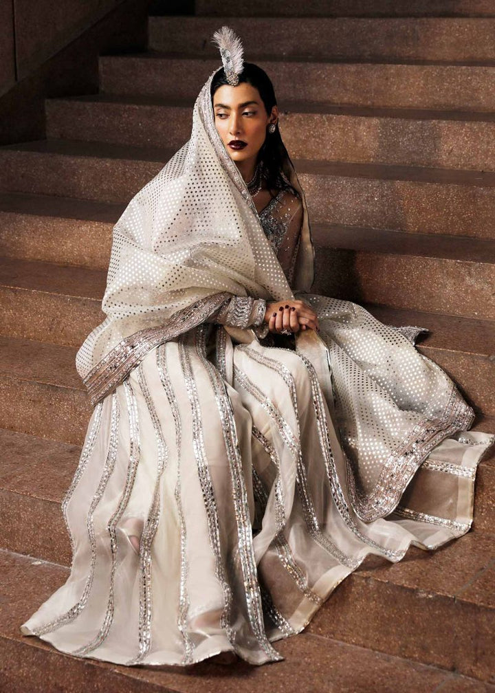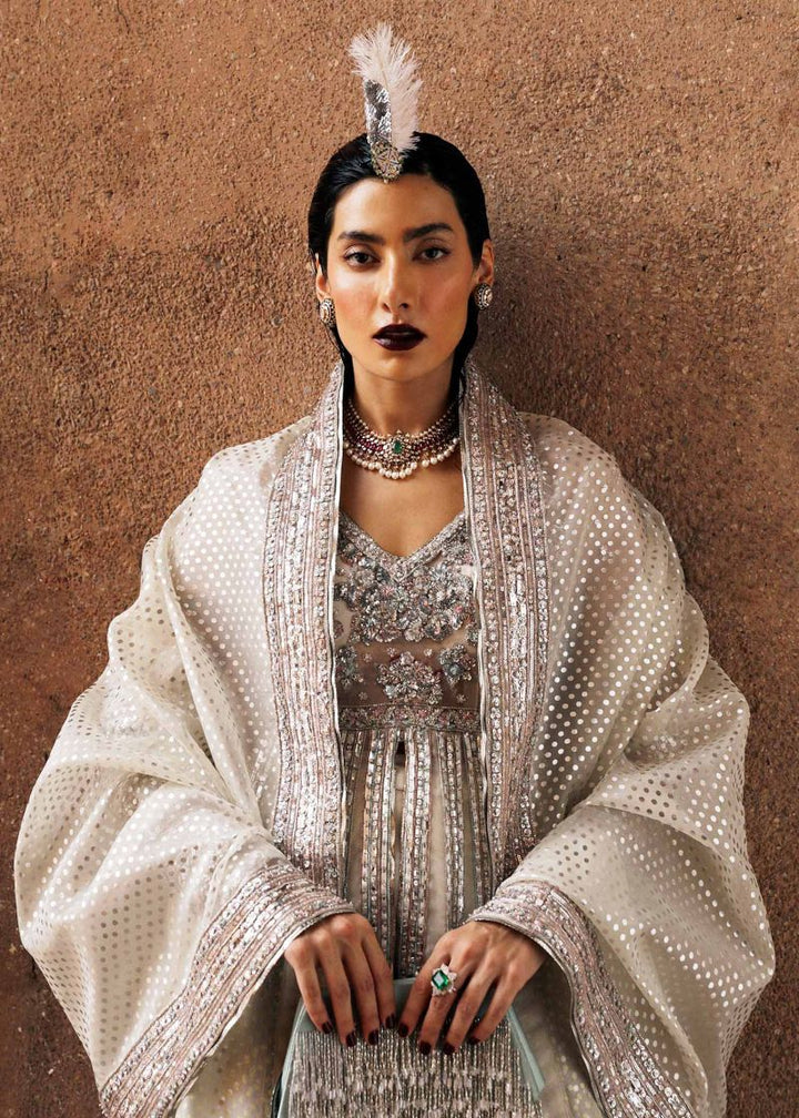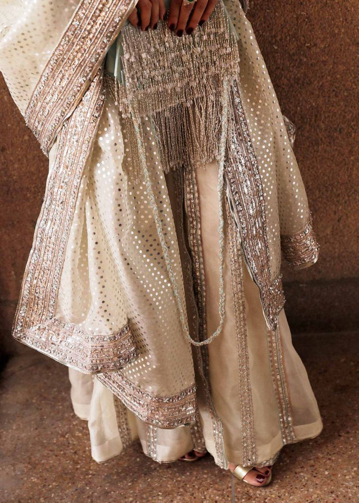 This beautiful ivory outfit definitely makes a style statement. It is paired with velvet pants and screent printed polka dots dupatta with heavily embellished borders on four sides with sequins, cut dana and with nakashi, dabka, making it a stellar piece.