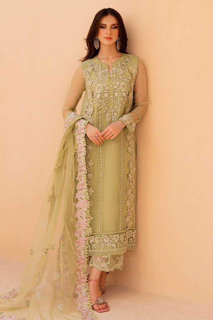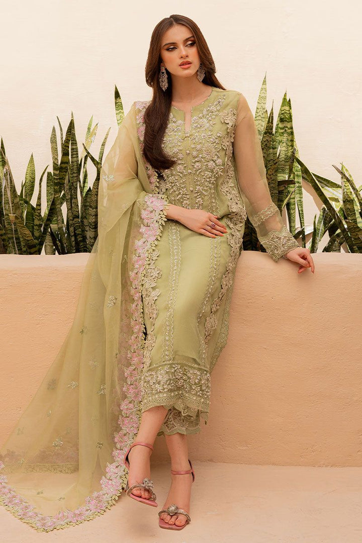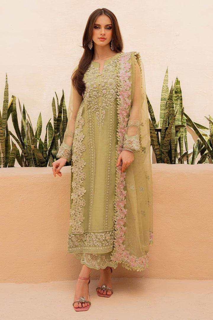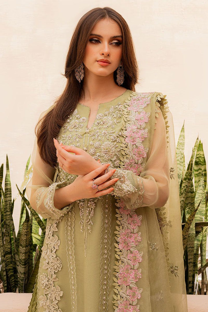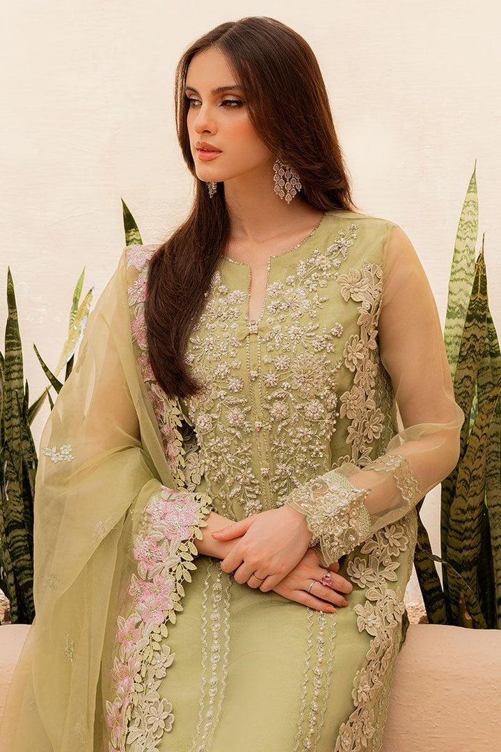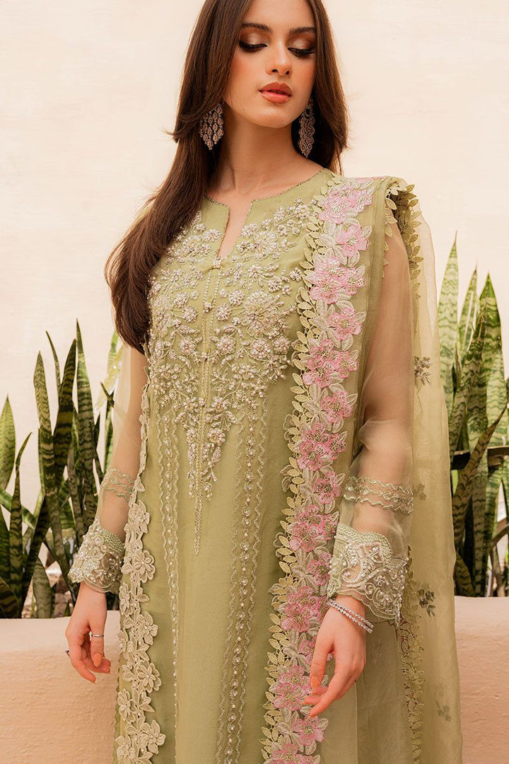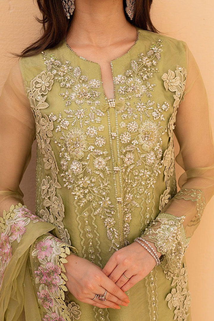 Make a statement in this green ensemble featuring elaborate hand worked and intricate bead embellishments. The rich embroidery is delicately crafted, showcasing skilled artistry and adding a touch of glamour to your ensemble