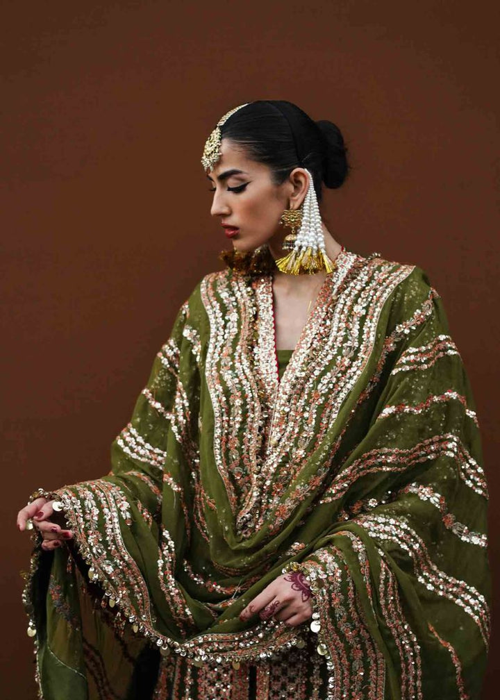 An outstanding stunner grassy green organza jacket enhanced with intricate blush pink buggle beads and sequins to create a graceful look. It is paired with a minimal chiffon sequined spray sharara and shirt with exquisitely embroidered border. It has been paired with a beautiful heavily embroidered dupatta.