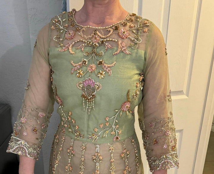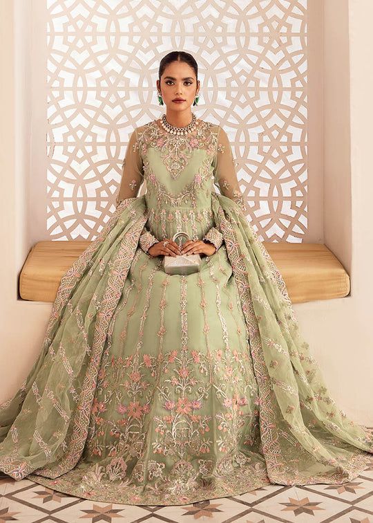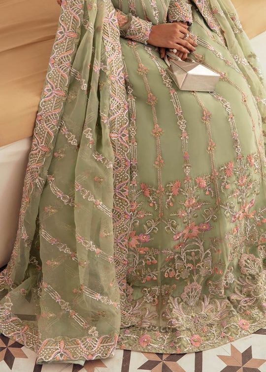 On an eye pleasing mint hue, Tanir exhibits a whimsical array of floral embroidery all over the organza pishwas, further enhanced with the spread of exquisite embellishments. Paired with a matching organza dupatta, fully covered with intricate embroidery and shinning sequins. The airy pishwas is a perfect set for the upcoming festive season.