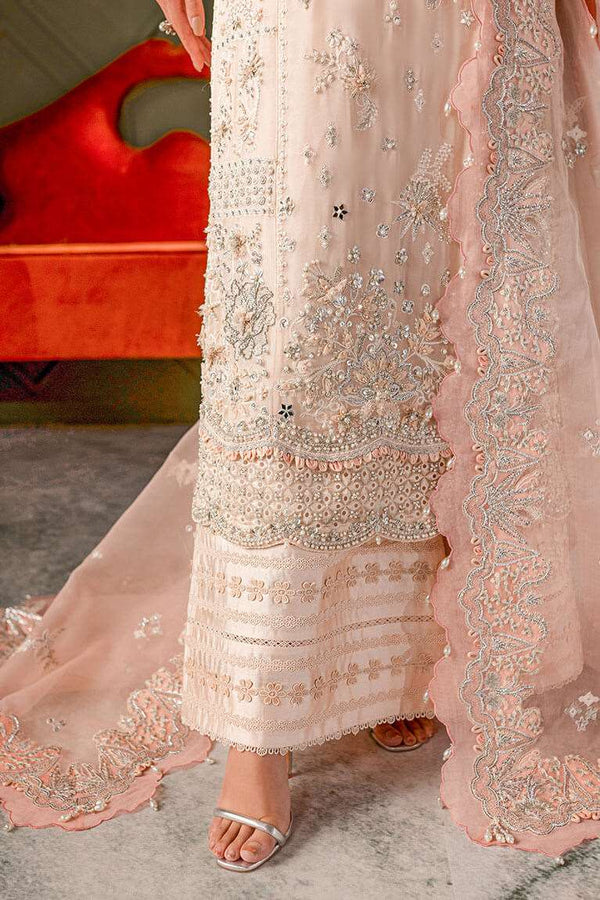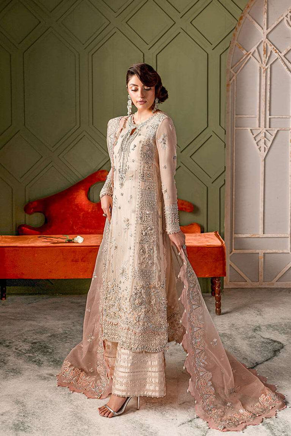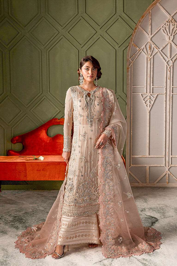 To enhance the fusion touch of the ensemble, it is complemented by a Zainab Salman signature ruffle jacket, which adds a dramatic and contemporary twist to the traditional heavily embroidered attire. For a traditional finish, this exquisite piece can be paired with a pure net dupatta, further elevating its elegance.