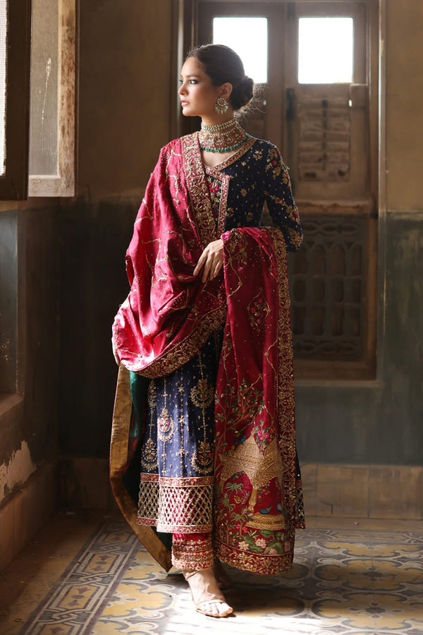 Look absolutely gorgeous in this navy angrakha! The shirt features red, green and gold flower details that adorn the neckline and body of the outfit. A heavy gold latice border anchors the shirt. The outfit is complemented by a stunning red dupatta that features dome buildings that are glistening in gold and a floral geometric pattern in the place of a sky.