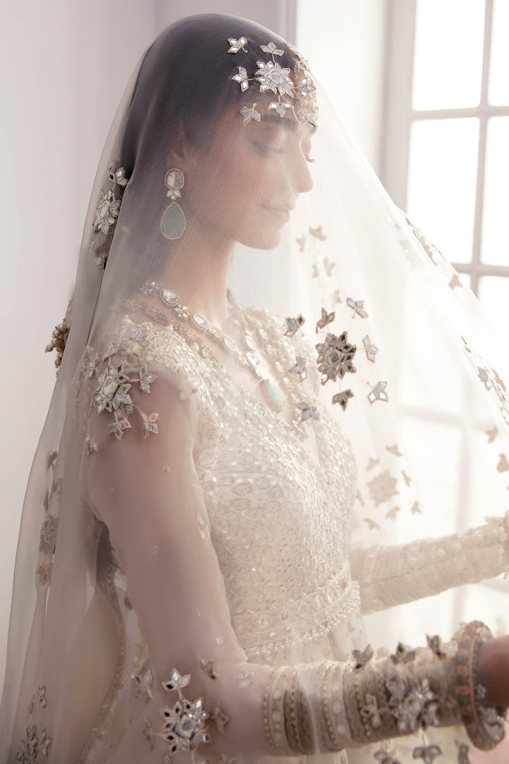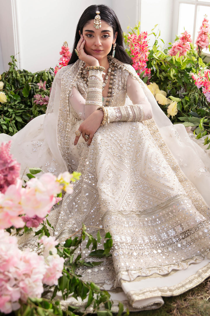 Step into the enchanting world of 'Parisa,' an ethereal ivory masterpiece adorned with a captivating fusion of shimmering silver and gold sequins, lustrous pearls, mirror-like tinsels, and sparkling gemstones. Meticulously embroidered panels unite to form a breathtaking heritage peshwas, boasting a finely composed bodice accentuated by a bejeweled belt. Completing this opulent ensemble is a dupatta embellished with intricate floral motifs and tinsel blooms, echoing the splendor of Eastern royal regalia. 'Parisa' epitomizes couture excellence, a collector's dream a classic, elegant, and timeless creation that transcends fashion's fleeting trends.