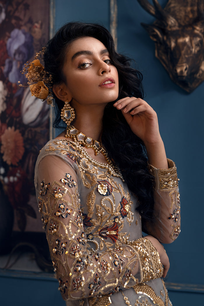- Hand embellished embroidered net front 8 panels