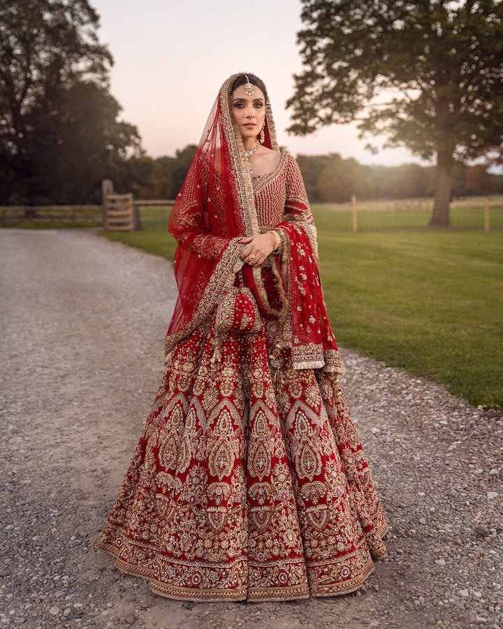 Description: Channeling exuberance and grandeur, Raeni encapsulates the regality of a classic red bridal. The set showcases bedecked motifs gleaned from Mughal inlay art wrought using dabka, naqshi, crystals and pearls. The booti jaal choli greatly accentuates the look due to its contrasting linear pattern. Edging its tulle dupatta are two borders and a gorgeous kiran lace. True to the FS couture aesthetic this bridal set exhibits the ultimate ageless opulence.