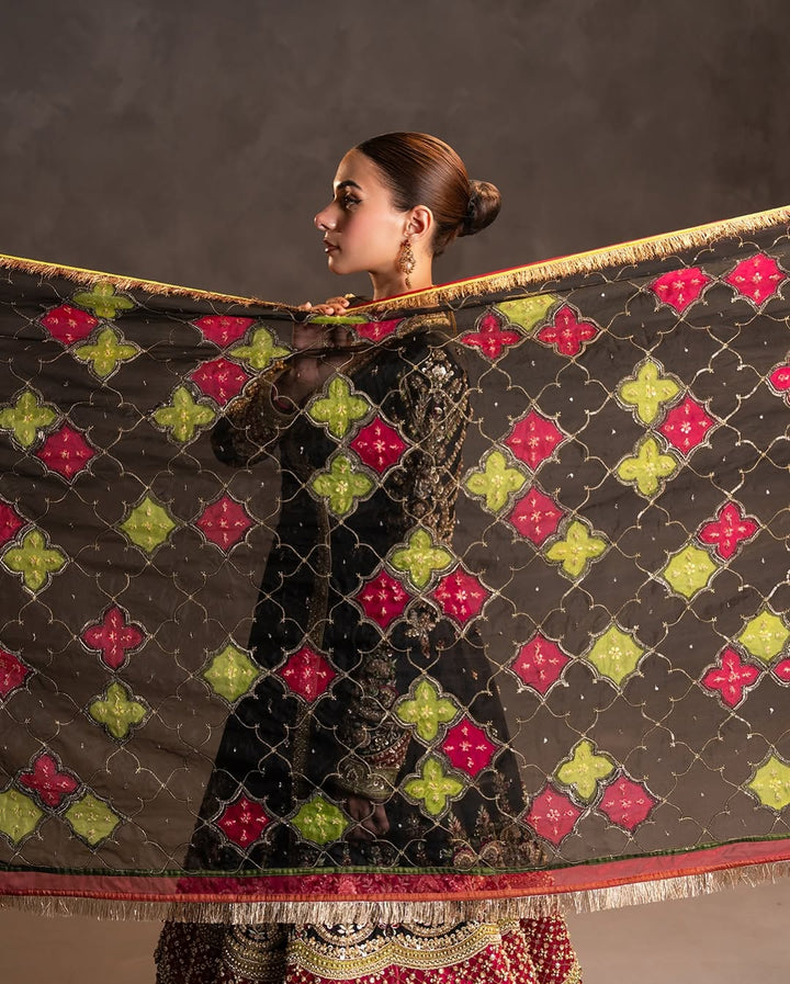 Ahmad Sultan ? Raqs is a mesmerizing ensemble that embodies elegance and grace. Featuring exquisite embroidery on luxurious fabric, this design showcases intricate detailing, delicate embellishments, and a refined color palette that exudes sophistication. The flowing silhouette and meticulously crafted patterns make it a perfect choice for festive occasions and grand celebrations. Whether it?s the intricate handwork or the regal aesthetic, Raqs captures the essence of timeless beauty with a contemporary touch.