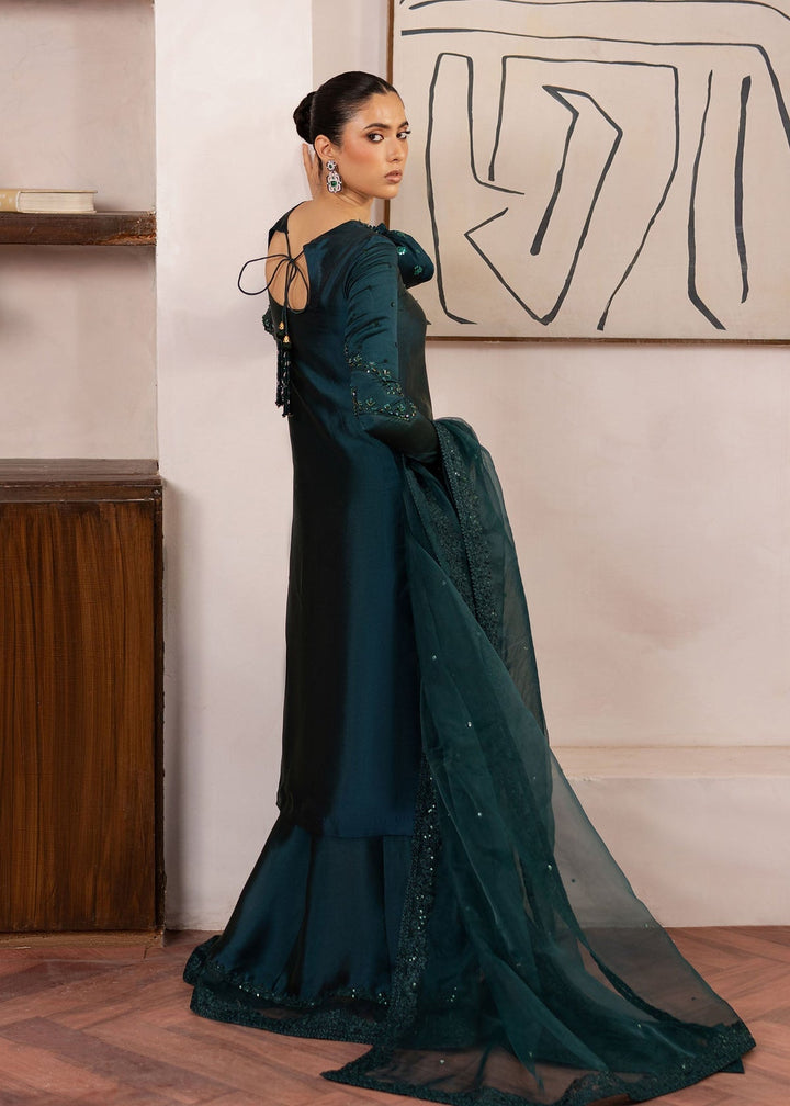 Bold and regal, this bottle green creation is rendered in lustrous tissue silk. The tailored shirt and trouser are paired with a featherlight organza dupatta, making it a striking choice for evening celebrations and festive gatherings.