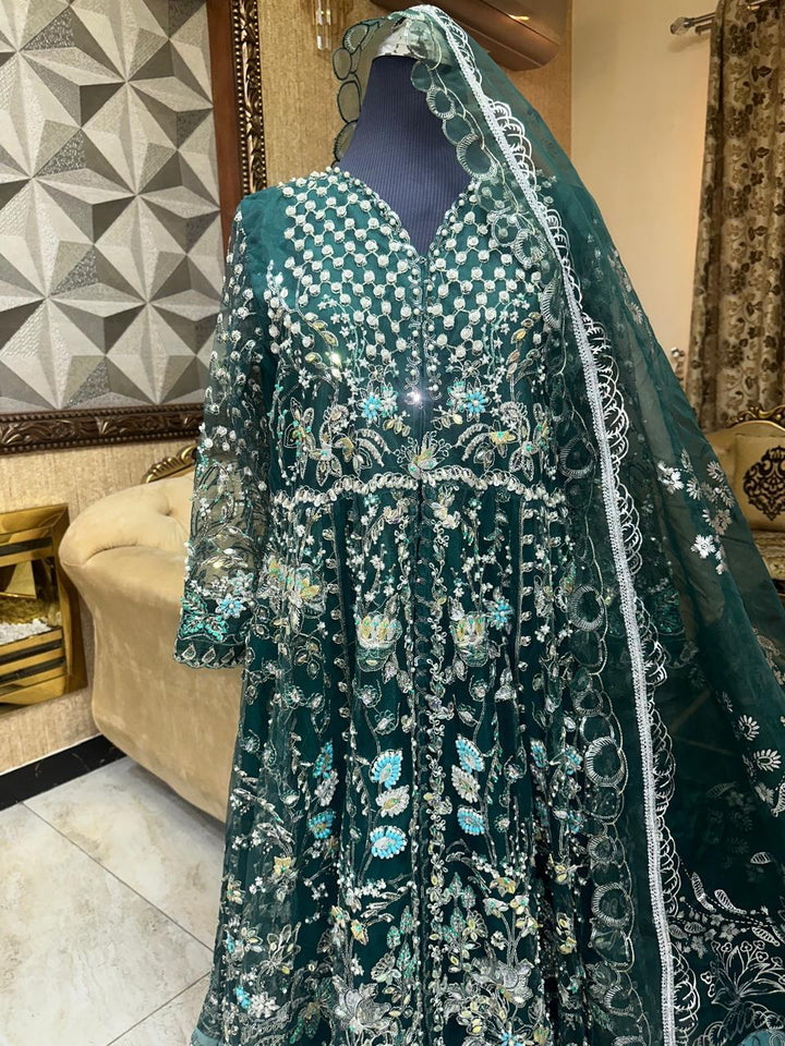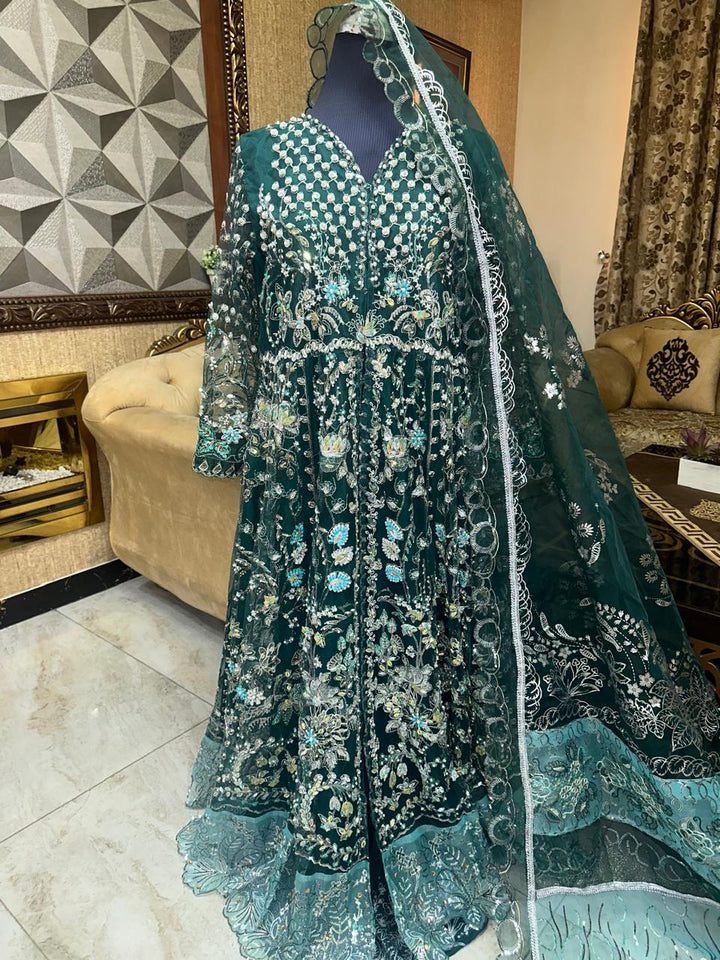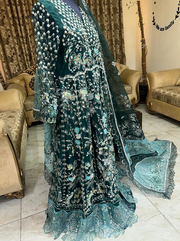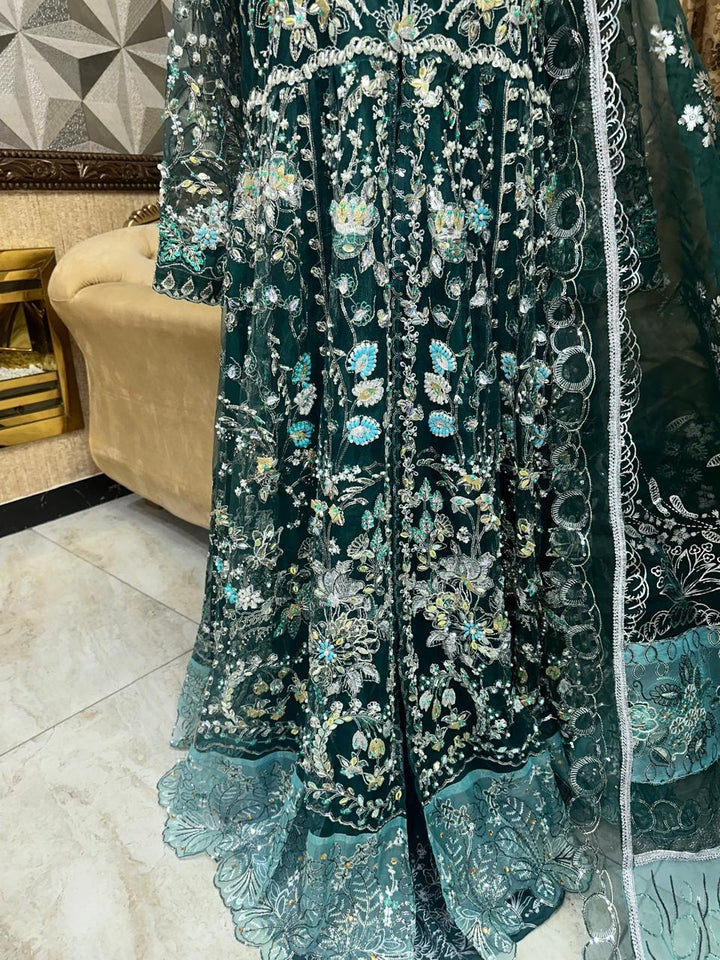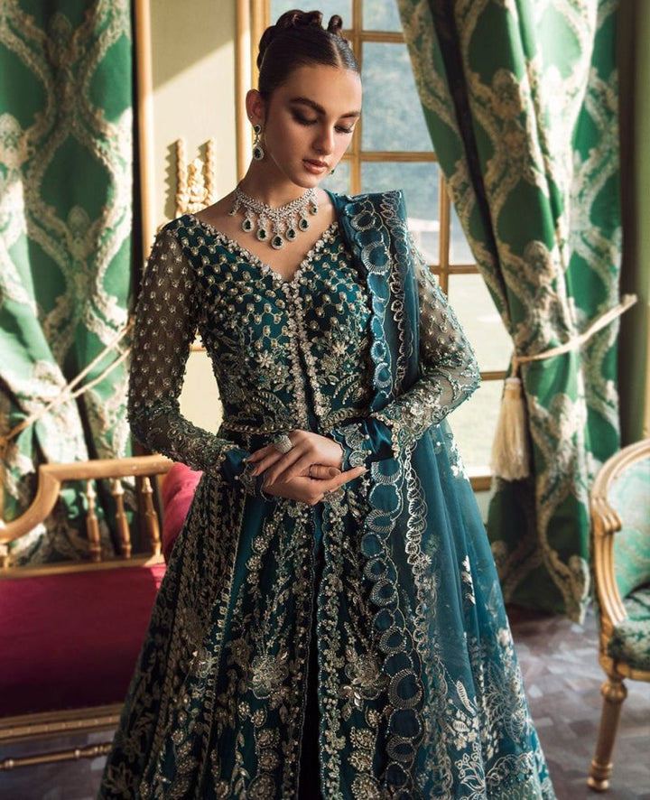 Glide your way through the festive season in mesmerising glamour clad in the meticulously crafted Une Jacinthe. A classic teal ensemble with an intricately adorned bodice with a classic V neck is clenched to a panelled shirt is fully encrusted with handwork bellishments, shimmering crytals, pearls and Swarovskis placed in stunning floral array. Worn over an embellished panelled lehanga. Paired with a teal organza foil printed dupatta with sequined scallope border; this ensemble is a statement par excellence.
