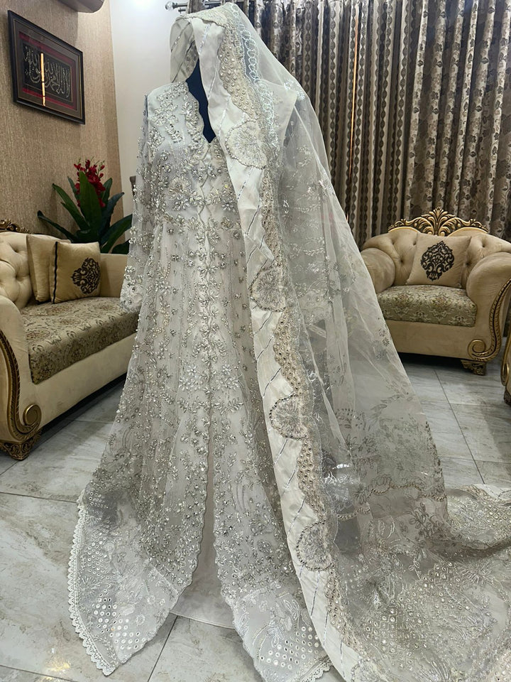 Detailed florals bloom in moonlit tendrils on the dreamy ivory organza canvas of Un Pavot, luxuriously laden with iridescent sequin, sparkling crystal and oyester pearls with dabka work creating an ethereal impact. Paired with an ivory organza foil print dupatta emblazoned with filigreed bootis, elaborately detailed borders and dramatically accented pants, this look is reminiscent of royal regalia and a perfect choice for any and all formal occasions.