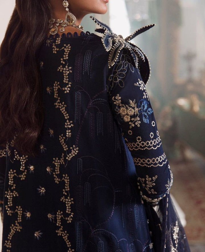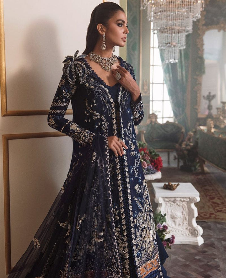 A tapestry of unparalled trees, vinning leaves, decorative florals in an oak silk midnight twp panelled jacket long shirt Une Campansule features intricate handcrafted details in dabka, gota, zardosi and pearls. Paired with an embroidered net dupatta with a shimmering ochre borders and scattered motifs is hung with intricately made tassels. Adding glamour with the printed tonal lehanga border.