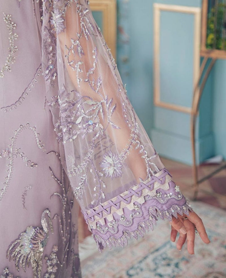 Le Lilas' is an outstanding scintillating lilac kaftan with a canvas of floating delphiniums, vines and dahlias. Heavily Handworked this gorgeous and trendy formal is a trendsetter for all events.