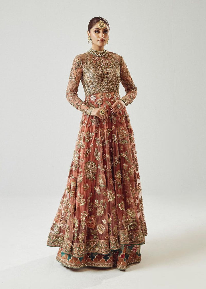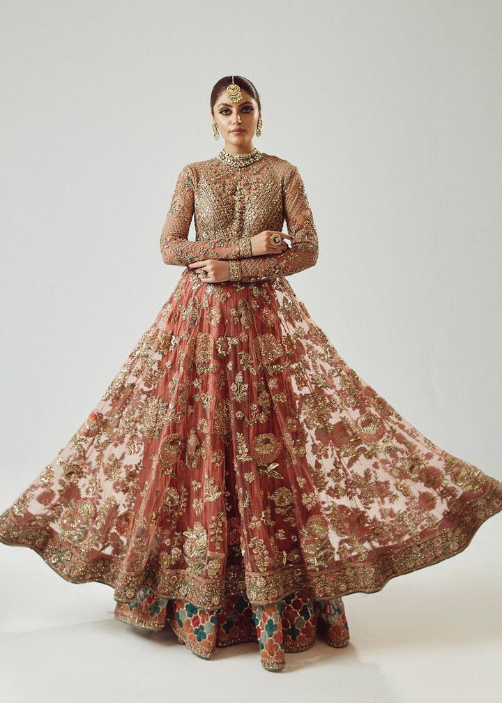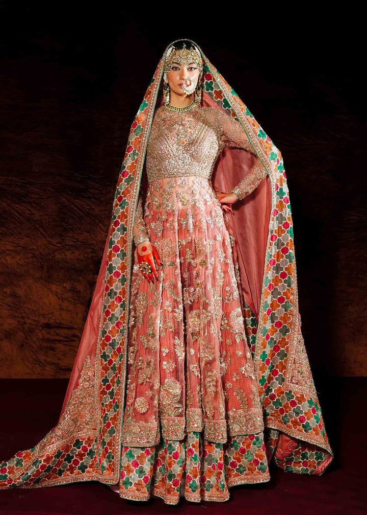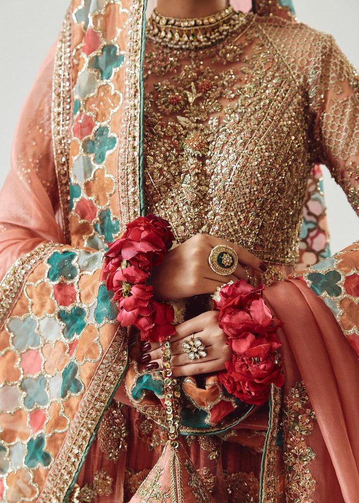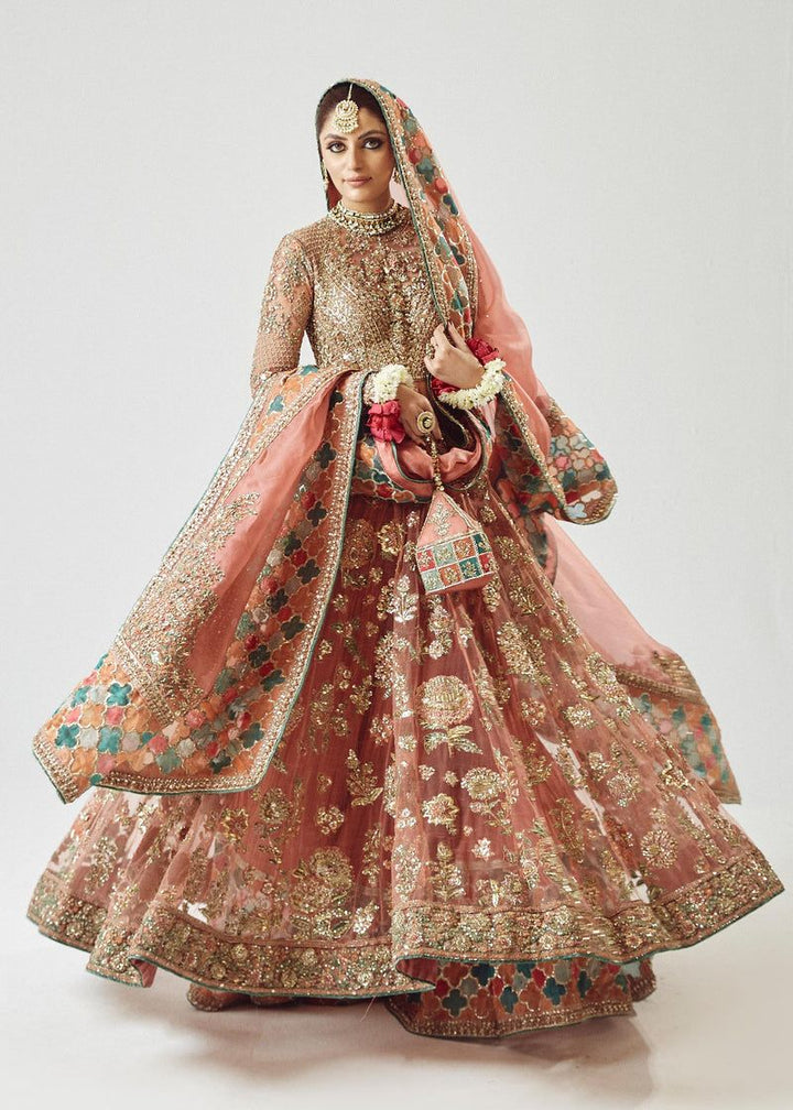A spectacular rose gold net peshwas. The exquisite reham embroidery, enhanced with intricate adda work, elevates this ensemble to new heights of elegance. The medium silk crushed sharara, adorned with organza chatapati borders, exudes a sense of regal sophistication. And the organza dupatta, adorned with mesmerizing adda work, and organza chatapatti four sided borders adding a touch of ethereal beauty.