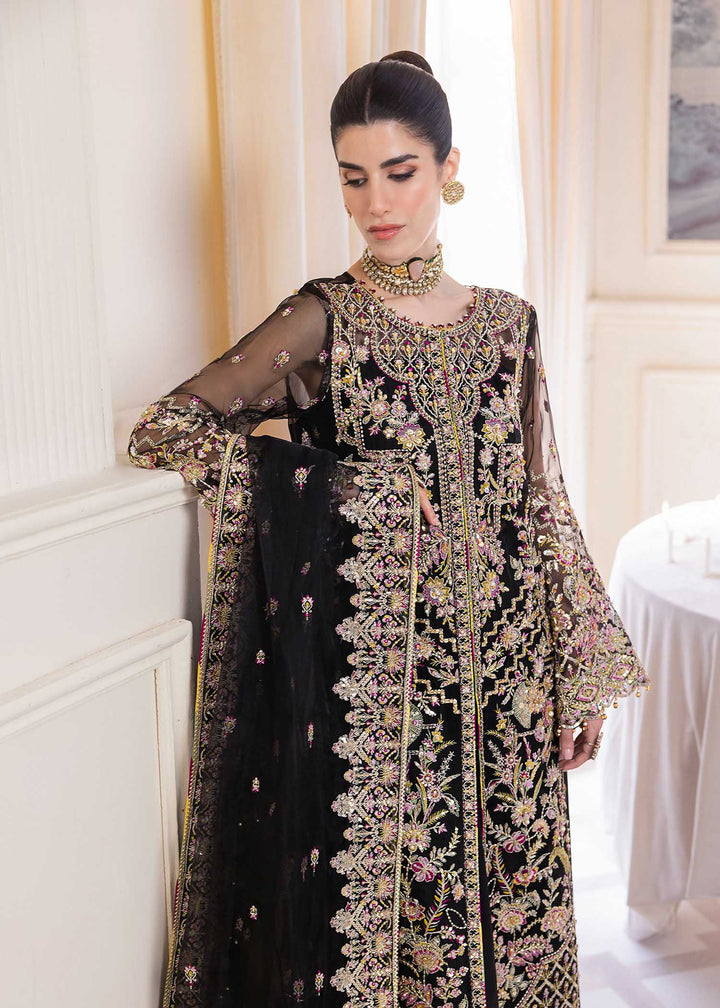 The black front-open gown is a masterpiece of craftsmanship, featuring intricate embroidery and embellishments that adorn its entirety. The rich black organza fabric serves as the perfect canvas for the exquisite detailing, with delicate threadwork, sequins, and beads creating a mesmerizing effect that catches the light with every movement. The front-open design adds a modern twist to the traditional gown, allowing for graceful movement and effortless allure. Complementing the gown with the flare pants, tailored to perfection to ensure a flattering fit. Adorned with a border along the bottom hem, the pants add a touch of sophistication to the ensemble while maintaining a sense of understated elegance.