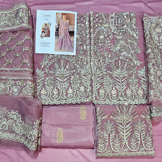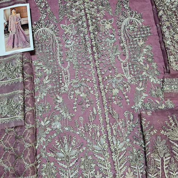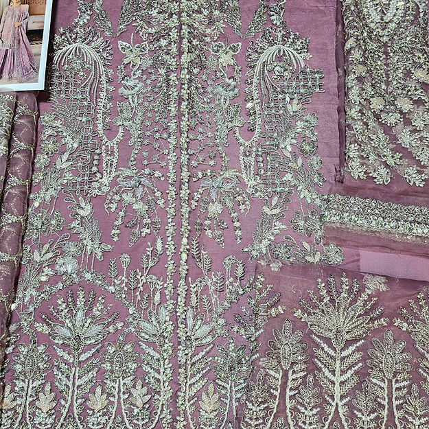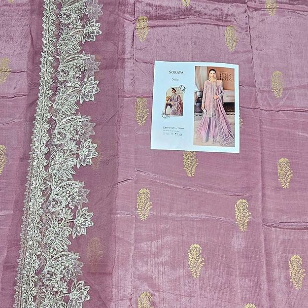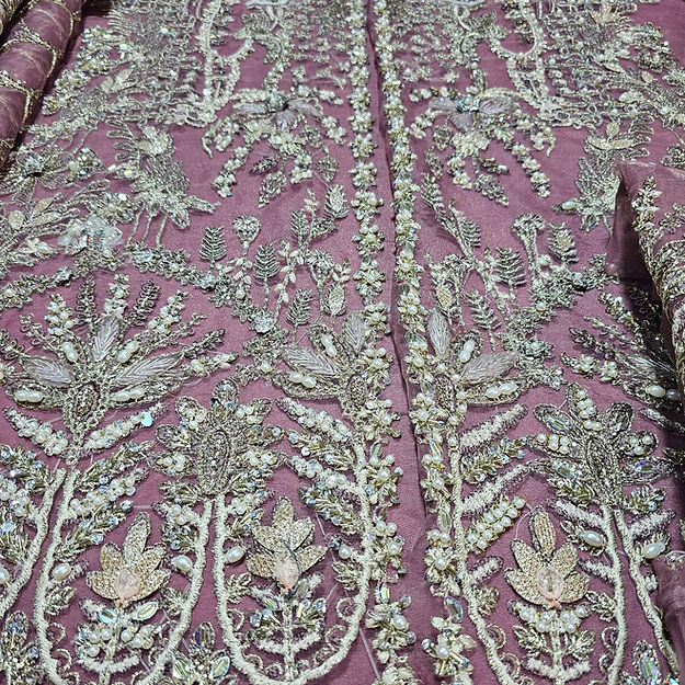 A perfect embodiment of celebration, ?Sehr? a graceful ensemble, featuring the timeless charm of dusty mauve.?This lavishly adorned Organza Jacket and airy drape dupatta with enchanting screen print, is skillfully adorned with intricate hand embellishments work, pairied with a Crushed Sharara, adding a touch of traditional work.