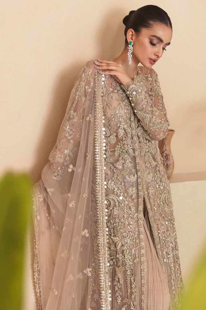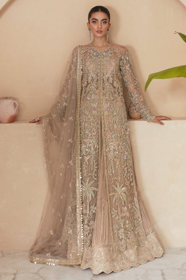 Dahlia is a modern technique masterpiece essayed in dull gold & skin shades curating an enchanted bridal piece. A mesmerizing net gown beautified with multi-hued pastel shaded work ornamented with gangajamni with sheesha details further fused with dabka and katdana work. A ravishing net dupatta modified with sequins laces and striking raw silk crushed pants adorned with organza borders makes it a statement attire for a perfect wedding day.