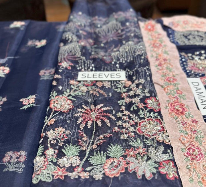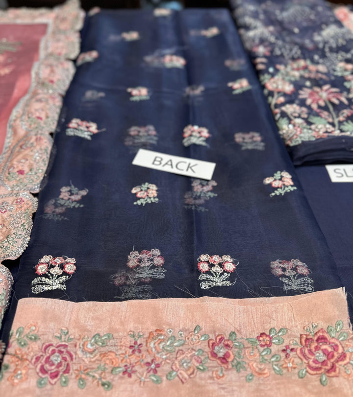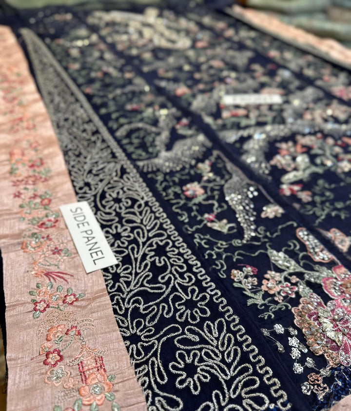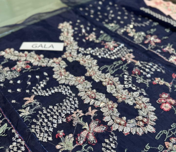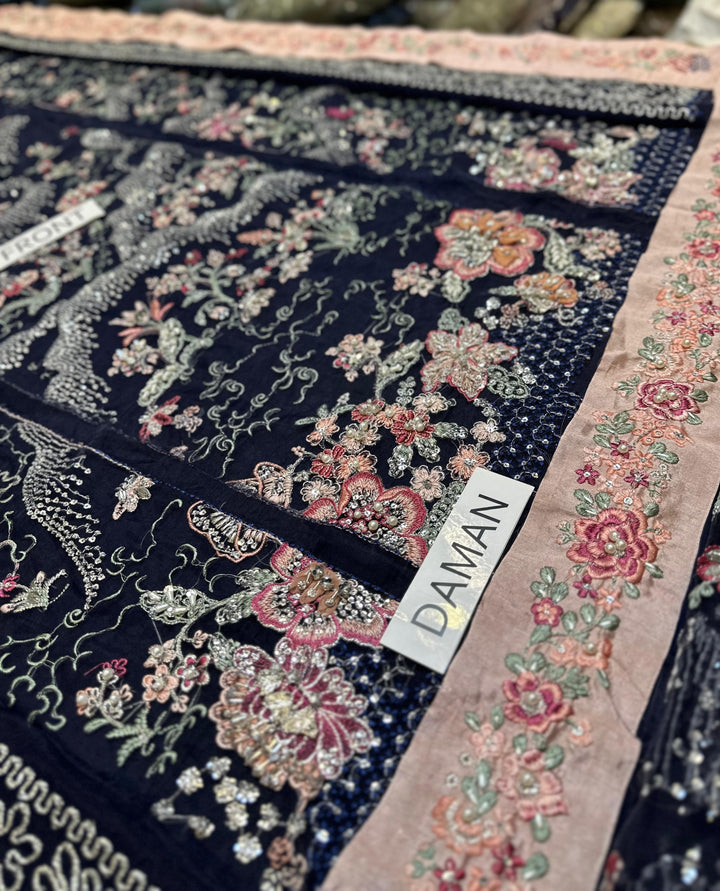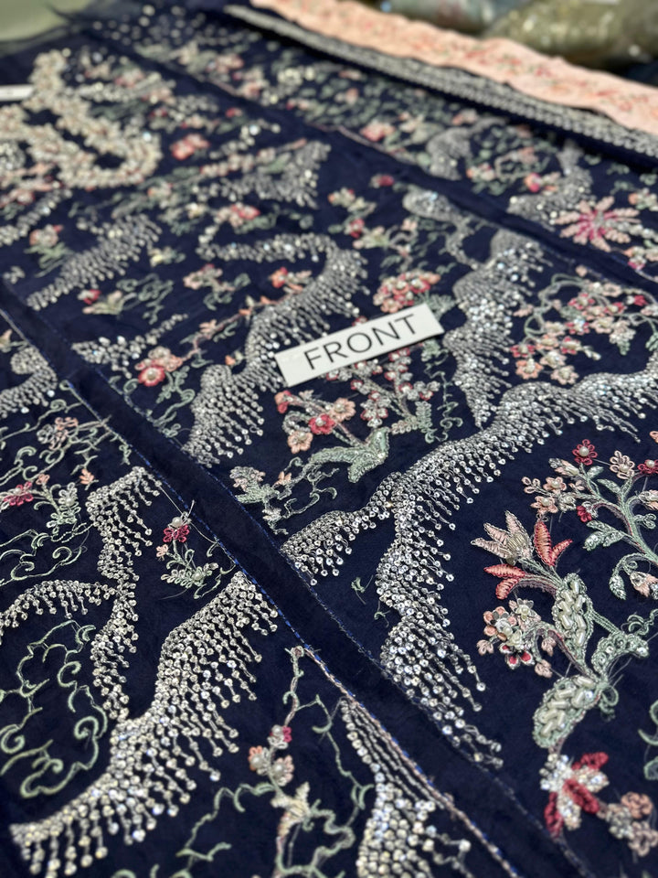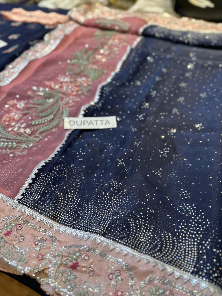 Stella dazzles in a majestic navy blue hue, adorned with intricate sequins waves that sparkle with every movement. A soft pink satin hem border adds a touch of vibrancy. The dupatta features embroidery in soft pink, coral, and lime shades, elegantly complemented by sparkling diamantes spray for added opulence, addition to it is a satin four sides border that make it culminating in a look that exudes timeless elegance and make it.