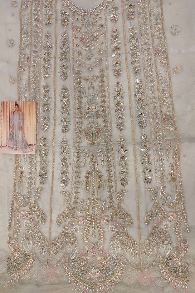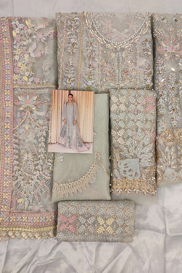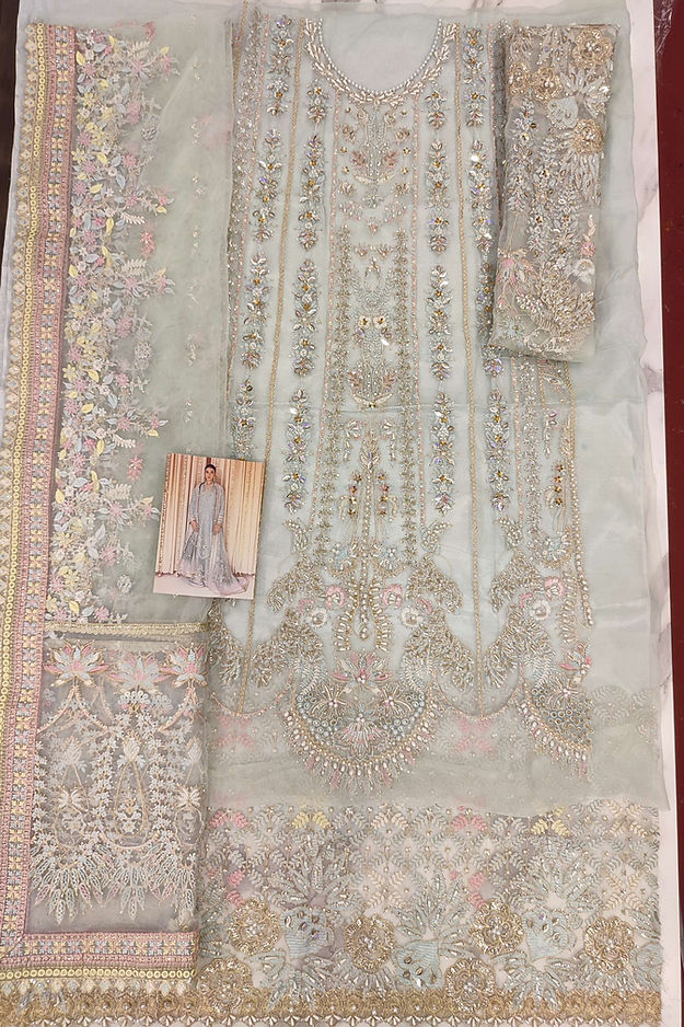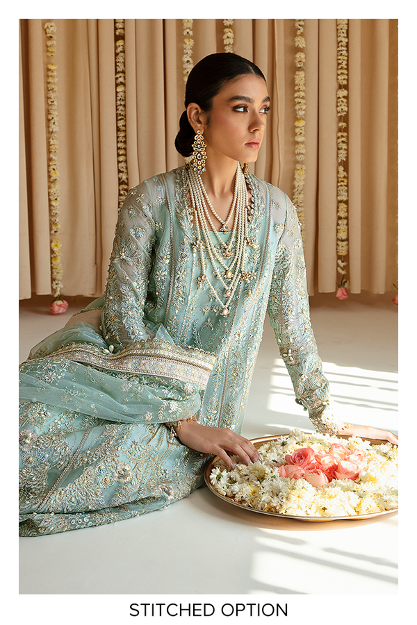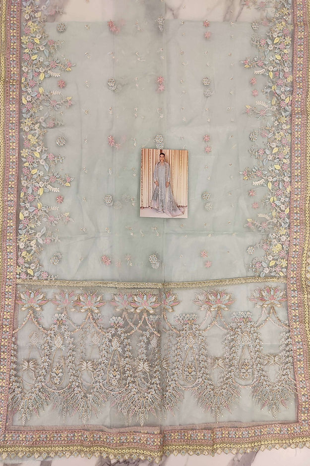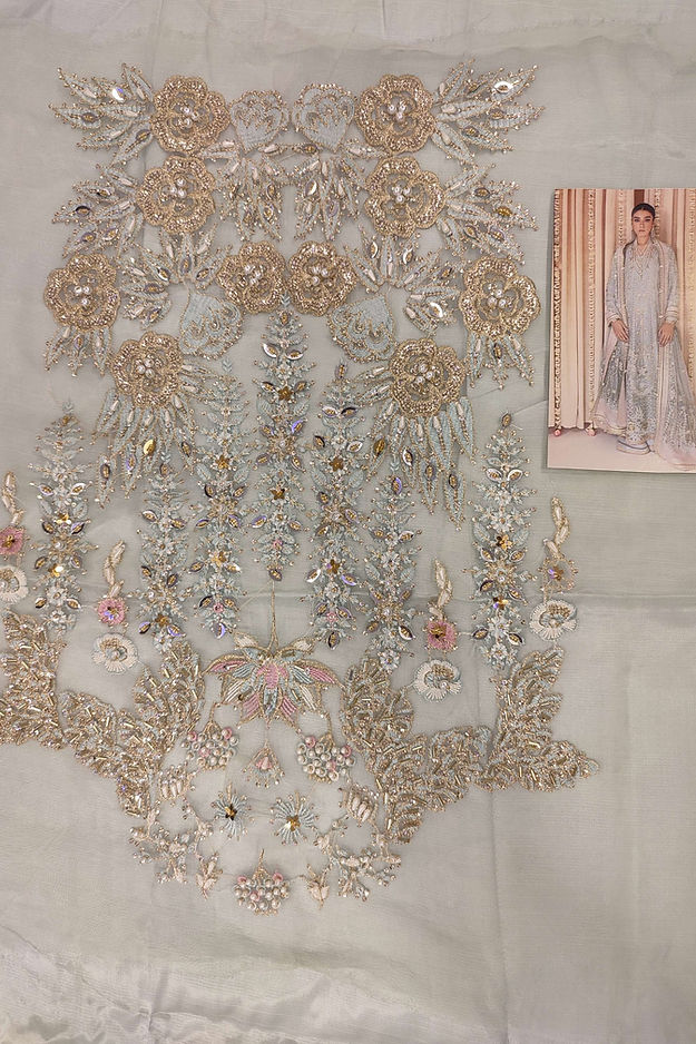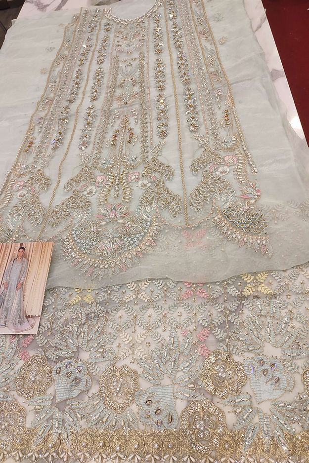 - MINT BLUE ORGANZA SHIRT WITH HEAVY EMBROIDERY, HAND EMBELLISHMENTS AND CUTWORK DETAILING.