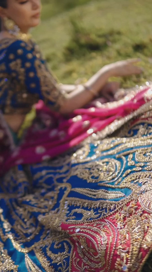 A tusser silk lehenga and a choli set of an admiral blue hue splashed with fuschia and yellow intricacies, and golden handwork. A fuschia pink zari organza dupatta with with heavy embellishments makes this look perfect.