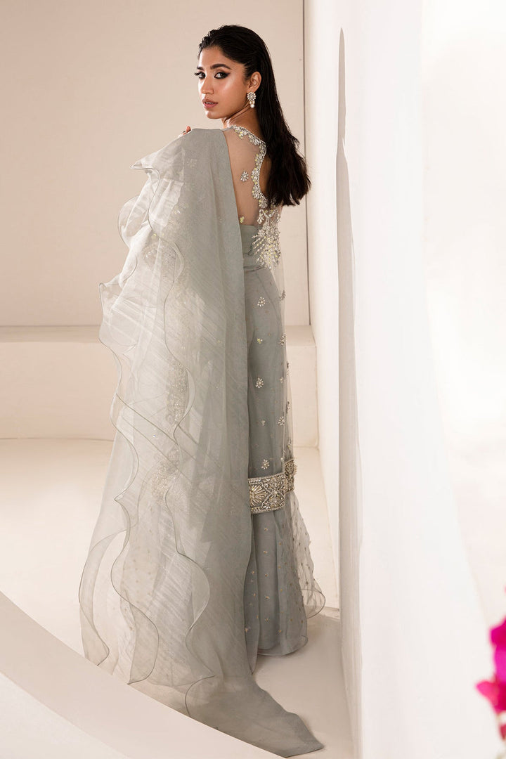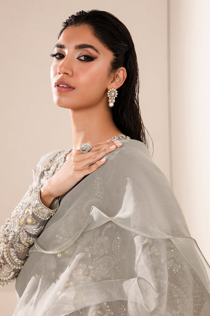 The turquoise hues of this bridal are making it the ultimate flattering outfit. The heavily hand-embellished net shirt creates aesthetic magic with its intricate motifs. Paired with a gorgeous pale turquoise dupatta that has richly embellished thick borders and threadwork. This look will make anyone stand out in the crowd.