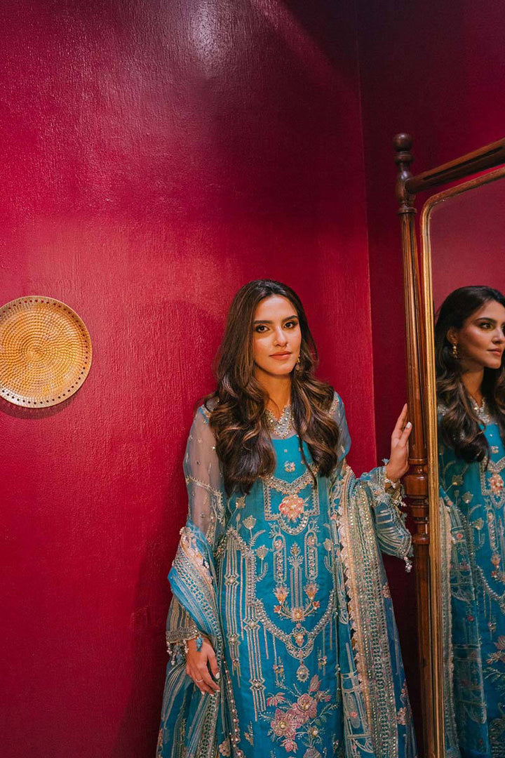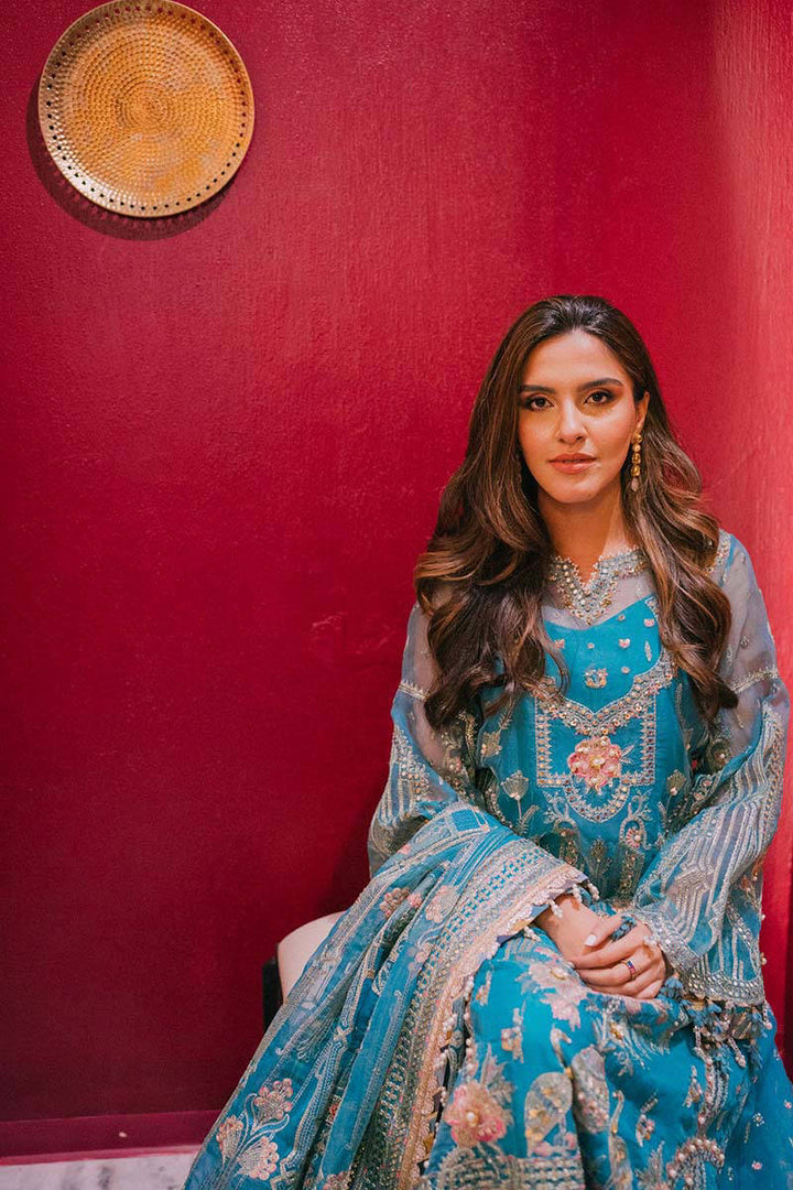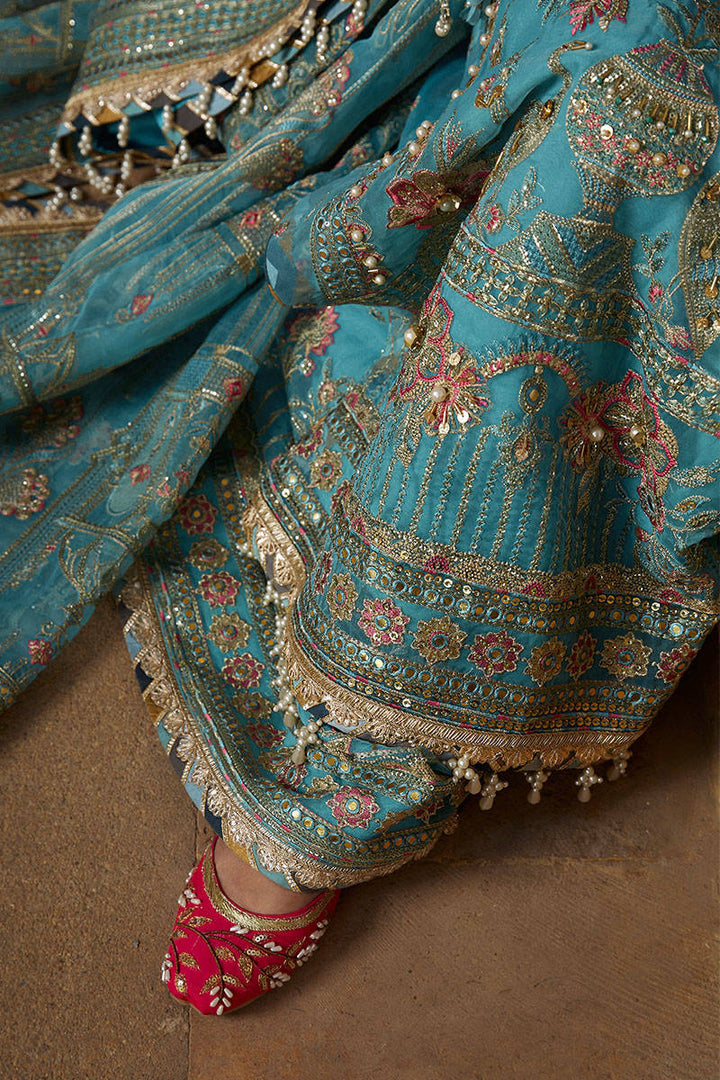 Sajal is seen wearing Umber, set on a dreamy asmaani blue organza base; The stellar outfit is doused with lush embroideries depicting classic arches, flora extracted from Mughal architectures made of fine strands of tilla, resham and accents of panni further enhanced by our signature hand embellishments. The composed shirt is matched with a generously worked lattice dupatta framed with embroidered borders and embroidered dhaka pajama finished with detailed borders.