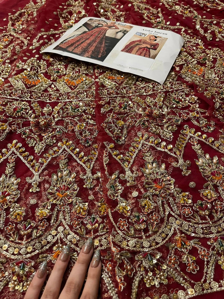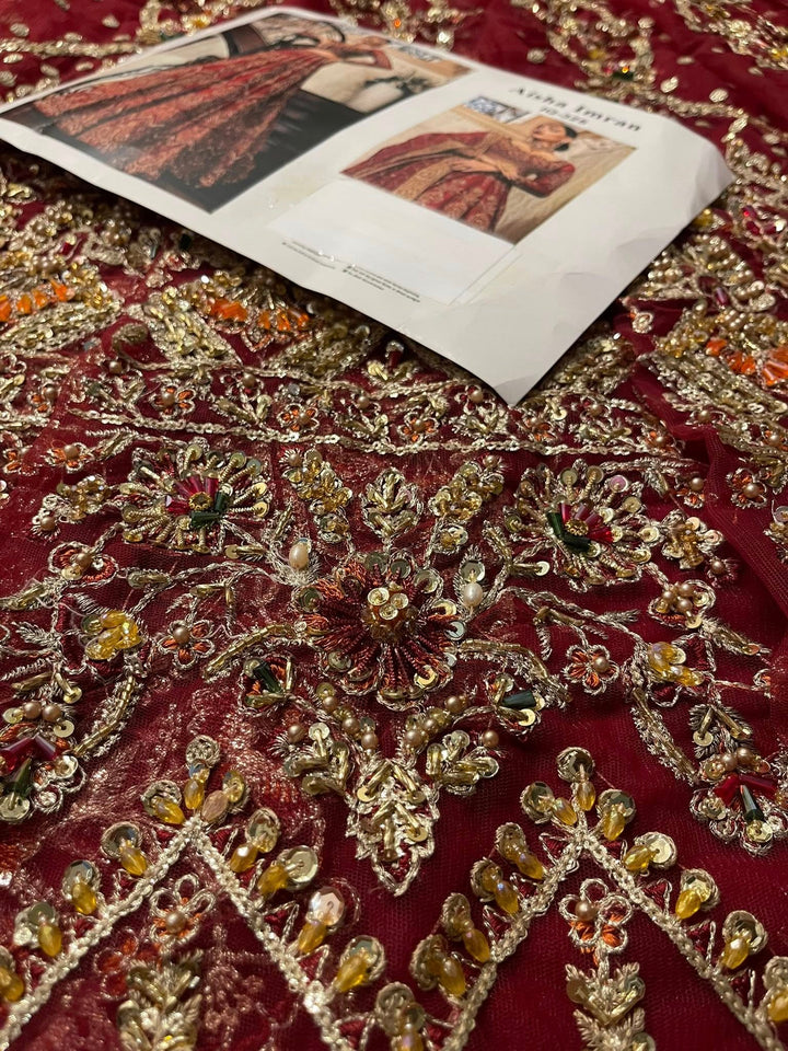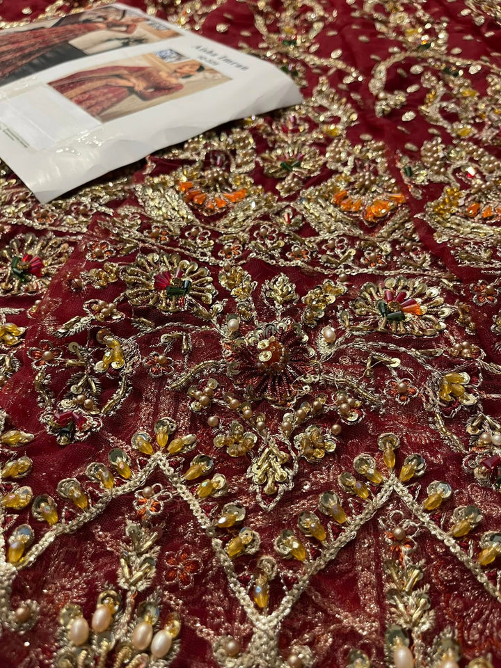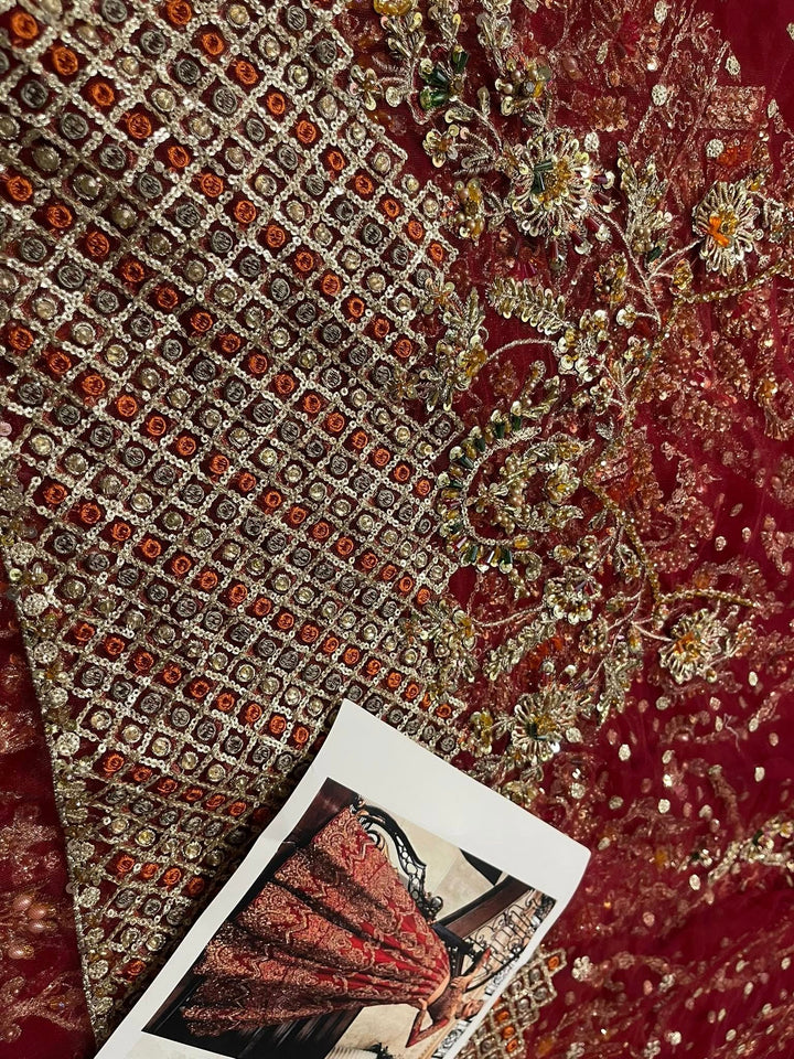 Uroos-e-Khas A vision of opulence and grace, this masterpiece celebrates the grandeur of timeless bridal heritage. Rich crimson tones meet intricate hand-embellished artistry, woven with shimmering embellishments to create a silhouette that whispers of royal charm. Each detail tells a story of elegance, designed for the bride who wishes to embody both tradition and allure on her most special day.