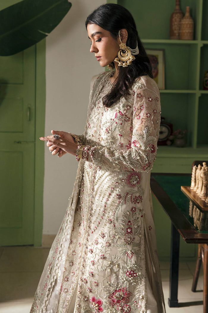 Irene is a dreamy festive apparel layered on organza canvas. An exquisitely draped open shirt embedded on opal white hue adorned with sage green, pink and red hints. It comes with an organza dupatta finished with embroidered borders and floral prints paired with refined silk pants concluding the outfit ethereally.