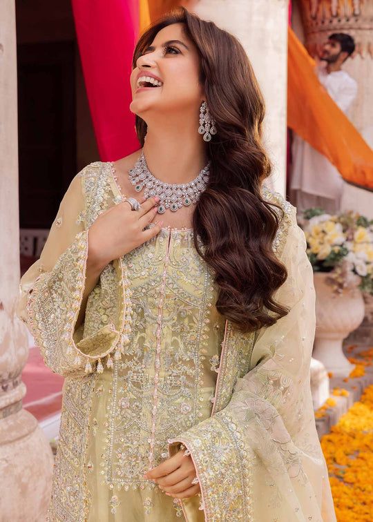 A vibrant lime yellow canvas with geometrical printed finishing inside the shirt is the perfect addition for the warmer season. To further boost this garment's appeal, side panels with diagonal embroidery patches and an additional side-seam dupatta have been added. The intricate multicoloured embroidered patches on the shirt are beautifully rendered in pastel shades with embroidered organza borders.