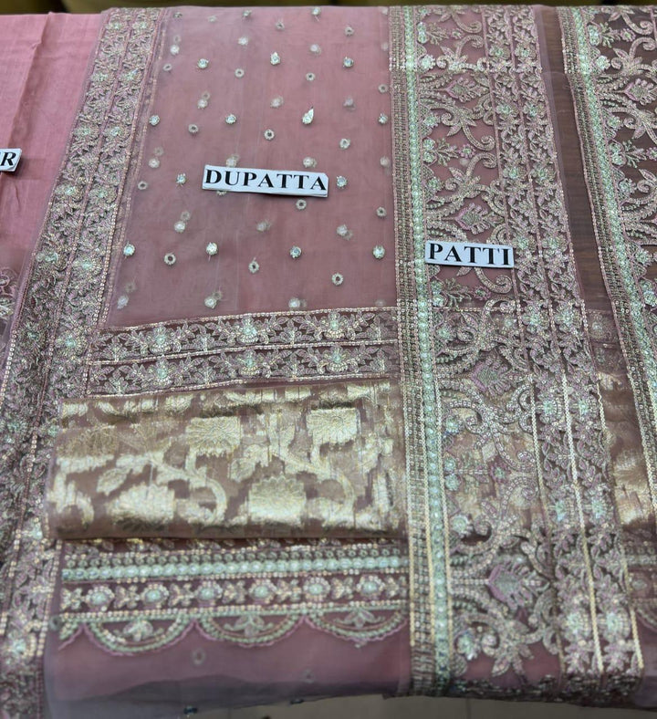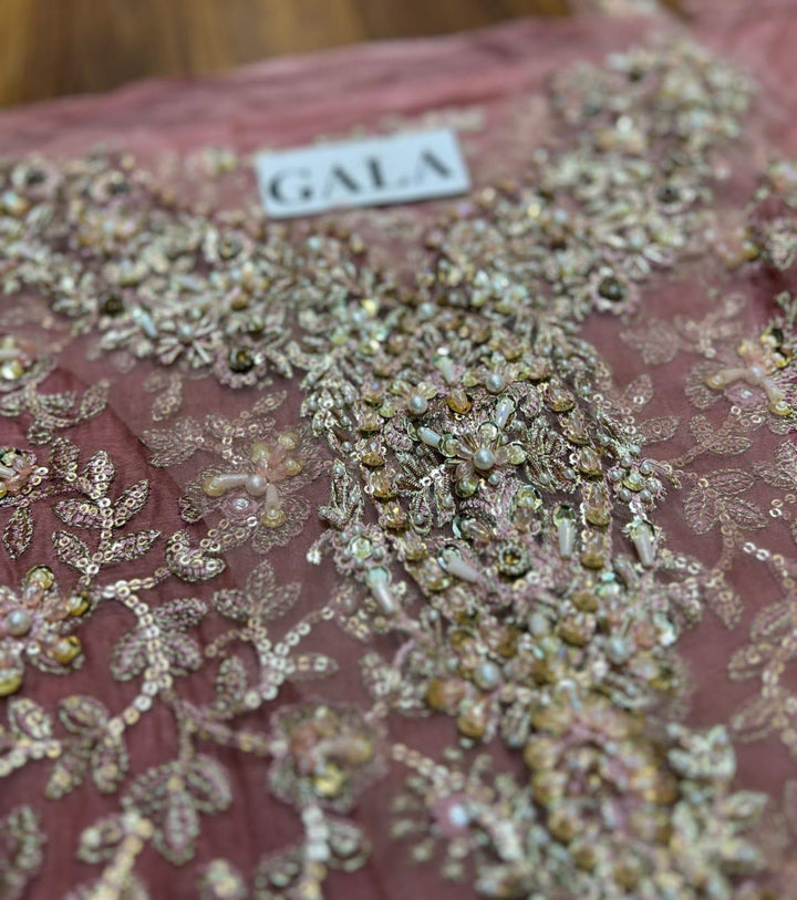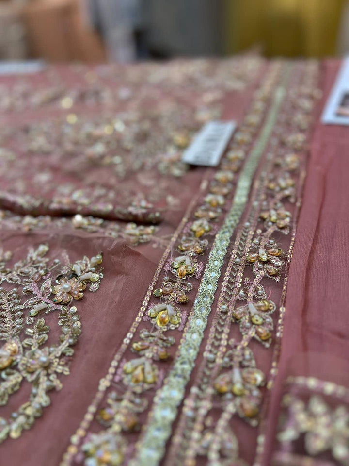 An alluring shade of pink is used as a canvas for a knee length kameez and sharara set. This feminine silhouette is ornamented with pearls, naqshi and dabka. Paired with an embroidered sharara and dupatta, the set is a staple for this season?s traditional affairs.??